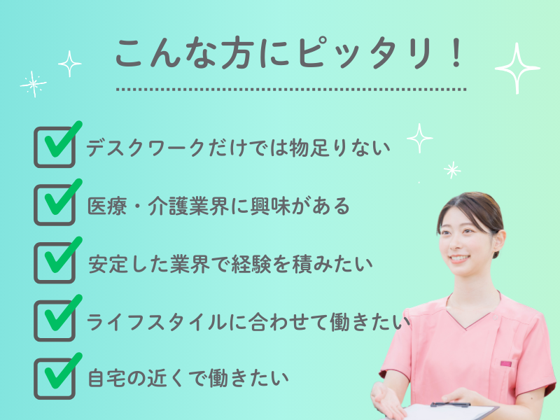 仕事内容 // 事務経験を活かして、安定企業で長く働く 賞与年2回/レセプト業務なし/転勤なし \\ - ✅高収入!賞与年2回あり ✅医療・介護の知識は一切不要 ✅先輩が横につくOJTで安心スタート ✅東証プライム上場の安定企業 「あなたの笑顔に救われました」と 入居者様・ご家族から感謝の言葉を いただくこともある、 やりがいのあるお仕事です◎ << 仕事内容 >> (1)データ入力、書類作成などの一般事務 (2)ご家族様の受付、電話対応 (3)ご入居者様の月々の費用請求 (4)ご入居時の契約サポート (5)備品管理などの庶務業務 など ※医療・介護保険のレセプト業務はありません ⭐OJTについて ―――――――― 入社後は、先輩スタッフがOJTを実施。 専門用語は入社後に少しずつ覚えればOK! 事務員は1拠点あたり2名体制なので、 急に一人で任されることはありません。 ⭐カンタン応募!必要時間は30秒! ――――――――――――――――― 「応募」ボタンから、30秒で応募完了◎ まずはお気軽にご応募ください♪ 以下からのご応募・お問い合わせもOK! 【LINE】 『@ishinkan』でID検索して友達追加! 【電話】 0120-910-194(本社採用課) ※時間:9:00~18:00 (平日のみ)