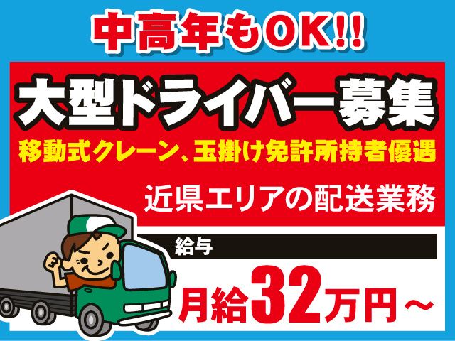 資格・経験 69歳迄(70歳定年のため) 大型免許 ※フォークリフト・移動式クレーン・玉掛等の免許をお持ちの方は優遇します。