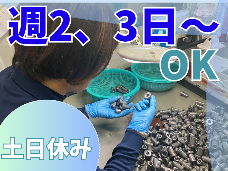 仕事内容 \40代~60代の主婦さん活躍中!/ ◆土日休み!週2,3日~OK! ◆平日フルタイム働ける方は歓迎! 月収19万円以上も可能です。 短時間のパートタイムから、 フルタイムに変わりたい方 社会保険に入り、しっかり働きたい方は歓迎します。 週2、3日勤務で扶養範囲内の勤務も可能です! ◆パートさんにも賞与年2回あり★ 自動車メーカーで使われるネジやナットを 製造している会社です。 仕事の内容はとってもカンタン! ネジやナットの製品にキズがないか 目視でチェックをする軽作業です。 キズかどうか、判断に迷う場合は ベテランの先輩に聞いてもらえたらOK 自動車産業の部品だけでなく 自転車の部品など、 幅広い産業の加工をしています。 常に安定した需要があり、 パートさんは、シフトカットなしで働けます。 残業して稼ぎたい方は 残業もできます。 (希望者のみで、定時退社も可) 直接電話でのお問い合わせも歓迎! TEL:090-4251-5265 面接時に職場見学、実際の作業内容も確認できます。 50歳以上や、60歳以上から働き始める方も多い職場です。 【事業内容】 製造業(自動車部品製造)