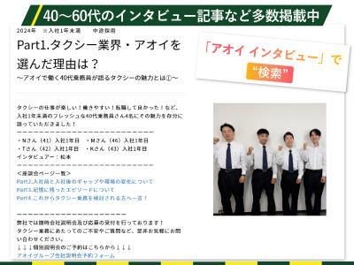 選考プロセス ★40代が語るタクシーの魅力とは?座談会はコチラ★ https://recruit-aoi-group.com/interviews/3340 【選考方法】 応募→個人面接→採用 ★「まずはちゃんと話を聞いてみたい」という方向けに 会社説明会を実施しています! ご希望の方はHP説明会予約画面からエントリー下さい! 応募の前に、説明を聞いてみたいも大歓迎! 【選考結果通知】 面接から1週間以内 【応募書類等】 履歴書(写真付き)、運転免許証