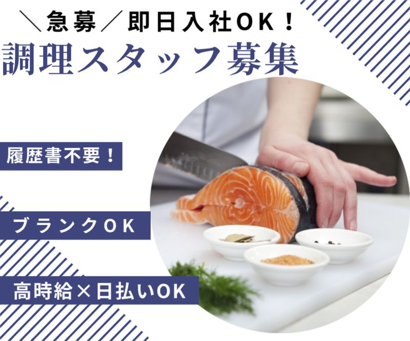 PR・職場情報 【服装】 ・制服貸与(コック服) 【喫煙環境】 ・室内禁煙 【職場環境】 ・ロッカー、更衣室、社員食堂、電子レンジ、冷蔵庫、キッチンあり ・消毒、マスク着用etc感染症対策万全! 【部署人数】 ・20名(男性5:女性5)平均年齢30代半ば 求人の特徴 ~応募から入社まで~ 応募から最短3日で選考結果を連絡! ※登録から職場見学の日程によって、最短3日でのご案内が難しい場合もございます。 <応募⇒最短当日に採用担当から連絡⇒登録⇒職場見学⇒入社> ≪急募のため、積極採用中!≫ ・即日~長期/3ヶ月以上 ※急募ですが、1月~、2月~、3月~、4月~など入社日相談OK! ご応募から最短即日に採用選考のご案内! 求人ポイント シフト自由・選べる,高収入・高月給,交通費支給,急募,扶養内勤務OK,副業・WワークOK,バイク通勤OK,社会保険完備,制服貸与,40代以上応募可,履歴書不要,友達と応募OK,週3からOK,固定時間制