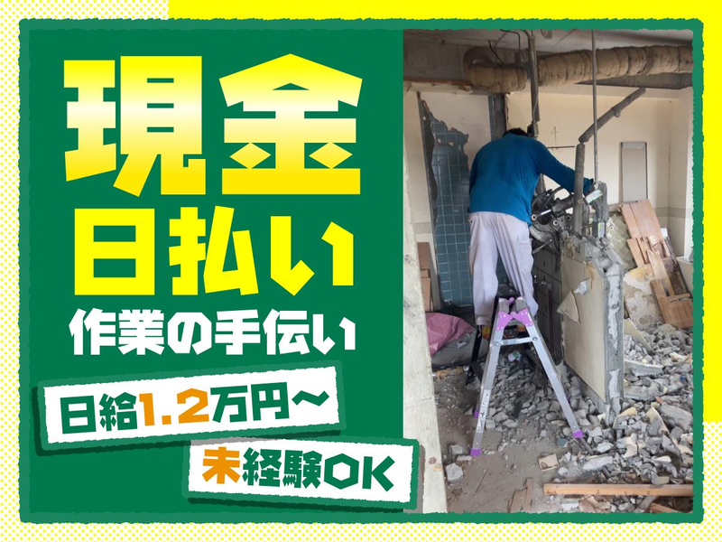 仕事内容 【仕事内容】 工事現場での清掃業務を中心に、 部材の運搬・片付け・養生などもお任せします。 慣れてきたら、多能工の知識をつけていくので、 未経験でも安心してできる仕事内容になっています◎ 【お任せする仕事】 「ここを掃除してほしい」「ここ片づけてほしい」「これを持ってきてほしい」と、 職人さんが指示を出した通りに動いていくことから始めましょう。 扱う道具の説明から行うので、全くの未経験でも問題ありません!