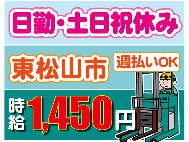 仕事内容 【仕事内容】 東松山市の大手物流企業でリーチフォークリフトを 使用した倉庫内作業をお任せします。 <具体的には> ・リーチフォークリフトでの荷役作業 ・倉庫内での日用品・食品・飲料などの入出庫作業 (ポイント) ・長期安定のお仕事 ・ガッツリ稼げる時給1,450円 ・土日祝休みでプライベートも充実 ・出張面接OK(お気軽にご相談ください) ・20代・30代活躍中 ・マイカー通勤で通いやすい (福利厚生) 交通費支給*当社規定あり 週払い制度(規定あり) (応募フロー) 〇ご応募 お電話/メール 〇当社から連絡(登録日時設定) ここである程度ご説明できます 〇ご登録 簡単、もちろん無料です 〇工場見学 色々見れて質問OK 〇お仕事開始 さぁ、新生活のスタートです 現在、ティ-・エム・エス鶴ヶ島インター支店 にて面接を受け付けております。 また現場付近においても出張登録も行っております。 Web環境を利用して自宅に居ながら登録出来る Web面接も随時実施しております。 電話でのご連絡もお待ちしております。 TEL. 049-289-4521 (採用担当まで) その他のお仕事はこちらから https://entori.jp/tms-tsuru