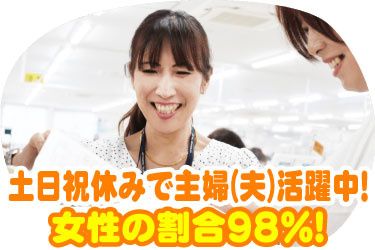 未経験歓迎の軽作業!土日祝休み 急な休みも柔軟対応!女性の割合98% <主婦(夫)パート活躍中>