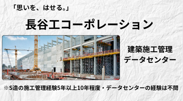 成長を続ける長谷工の建築施工管理:データセンター(経験は不問)※S造の施工管理経験5年以上10年程度