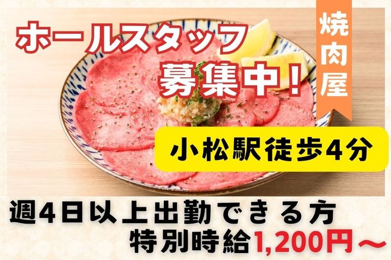 ⭐週4日~OK✅焼肉店経験者優遇✅時給1,200円✅小松駅徒歩4分✅無料Pあり