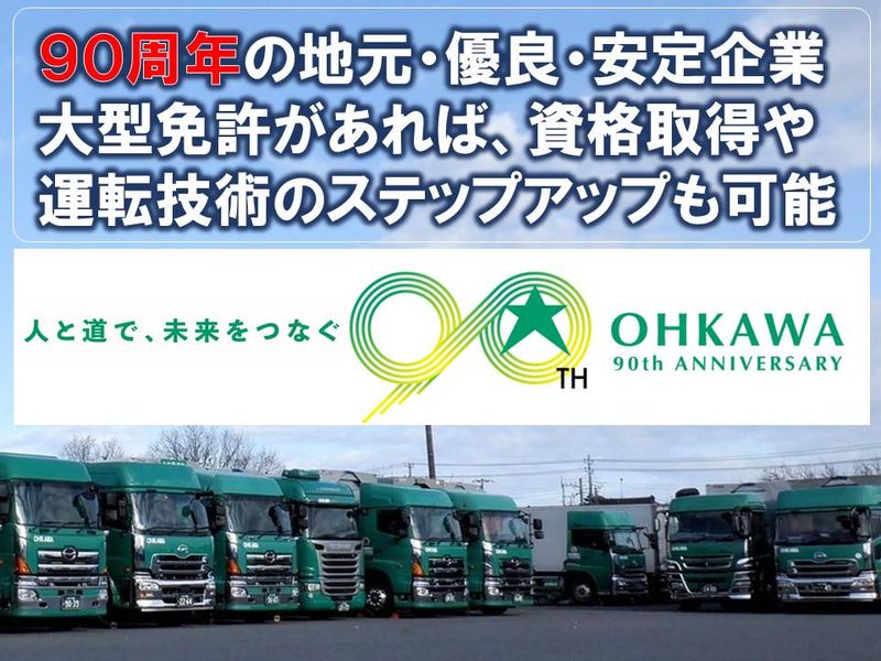 仕事内容 《ここがPoint! 》 ◎創業90年、地域に根付いた運送会社! ◎賞与年2回/昇給年1回◎住宅手当等あり! ◎アットホームな明るい会社 ── 会社紹介 ────────── 【大川運輸株式会社】 高品質な輸送と迅速な対応を重視し、 長年の経験と実績を活かして、 お客様のニーズに応えています。 安全管理や環境への配慮にも力を入れ、 信頼されるパートナーとして成長を続けています。 保有車両:1000台以上 自動車運送業者の 「Gマーク」 「働きやすい職場認証制度」 「健康経営優良法人」 認定 ~~・~~・~~・~~・~~・~~・~~ 【応募方法は下記!】 お気軽にお電話ください! ※まずはお電話でのお問い合わせ、大歓迎です。 お電話 ▶ 0299-82-4555 WEB応募!をクリック ~~・~~・~~・~~・~~・~~・~~ *【仕事の内容】* 鹿嶋工業地帯の大手メーカーの輸送です 荷物:建築資材 積込:茨城県神栖市、高萩市、千葉県成田市 ※「積待ち」は比較的少ないですよ! 配送地域:南東北、東海地方 ・乗務員1名に対して、固定で車両が 割り当てられます(1車1人制) ・平均走行距離1万km/月 ・現在、ほぼ土日は休み。 ・積み下ろしほぼなし! ・リフト資格は取得可 ・車のメンテナンスはディーラーが 行いますから、運転に集中できます。 ・調整可能な仕事ですので有給は取れます! ・ドライバーによる 積込・荷下ろし作業はなし! ・安全服、ヘルメット、安全靴、他 (すべて会社から) ✬ていねいに研修を行います。 ✬安全講習の受講、 危険物取扱の資格取得なども 会社でサポートするので ご安心ください。 ✬大型・中型ドライバーから ステップアップしたい方を大歓迎! ご希望に応じて フルトレーラーの運転も可能です。 - 【職場環境】 ・特殊車両の乗務経験が 豊富なスタッフが多く、 未経験の方をしっかりサポートします。 ・安全な運行のため、 社員教育に力を入れています。 ・定期的なミーティングや研修をおこない スキルアップ・資格取得も応援します。 ※ドライバーの方でも ドライバー以外のステップアップ制度あり (例:運行管理、配車) ※基本的に1車1人制ですが、状況により変更します。 ご了承ください。 - <最短1分で応募完了> 『電話応募』もしくは、 画面下の『応募画面へ進む』ボタンを 押してカンタン応募。 応募〜採用まで、 最短7日程度でご案内しております。 - 【雇用形態】 正社員 <アピールポイント> ✬ 大型免許を活かしてチャレンジ ✬月収40万円〜可能! 手当も充実! ✬ 賞与&定期昇給あり! ✬ きめ細やかな研修や安全対策で 安心して働けます (会社負担:牽引、玉掛け、危険物取扱、 フォークリフトなど資格制度あり) <企業紹介> 大川運輸は、鹿島の地で創業90年。 トレーラー・ガラス運搬専用車・ タンクローリーなど特殊車両を中心に 1000台の車両を擁し、 県内でもトップクラスの運輸会社として 成長を続けています! 社員の皆様の福利厚生にも力を入れ 「働きやすい職場認証制度」の 認証を受けた、 長く安定して働ける職場です。 \\スタッフさんへインタビュー// ________ 社員Aさんより  ̄V ̄ ̄ ̄ ̄ ̄ ̄ 転職をする際に大事にしていたのは、 ・安定企業であること ・働きやすい環境であること この2軸をメインに考えていました。 弊社は安定はもちろん、 有給休暇もしっかり取得できるので 子どもの行事にも行けるようになりました! ________ 社員Bさんより  ̄V ̄ ̄ ̄ ̄ ̄ ̄ 以前の会社でもドライバーの仕事をして いましたが1台を2~3名の交代で乗る為 たばこの臭いが気になっていました。 ですが、当社は1人1台の専用車!! 自分だけの空間で快適に お仕事できています!! 人間関係も良好なので悩みもありません!笑 ________ 社員Cさんより  ̄V ̄ ̄ ̄ ̄ ̄ ̄ 化成品(工業薬品)を取り扱うこともあり、 正直最初は不安がありましたが、 実際に触れることなどはないので 安心してお仕事できています! また、シンプルな作業が中心なので 未経験でも大丈夫でしたよ! 【会社概要】 企業名 : 大川運輸株式会社 設立年月: 昭和10年 事業内容: 鋼材・硝子・食品・燃料等の 運送事業 所在地 : 茨城県鹿島市 従業員数: 600名 会社URL: https://www.ohkawaunyu.com/