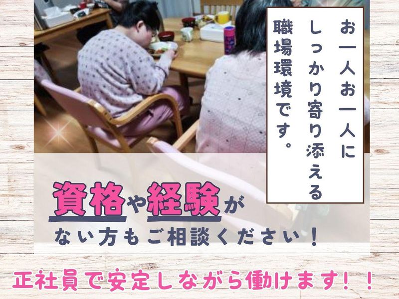 仕事内容 ■仕事内容 \業務拡大につき増員募集/ 安定した社会福祉法人で、新しい仲間を積極採用中です。 「社会福祉法人つむぎ」が運営する 女性専用の障がい者グループホームで **生活支援員(世話人)**としてご活躍いただきます。 ■この求人のポイント ✔ 未経験OK・無資格OK(福祉デビュー歓迎) ✔ 正社員×月給27万円以上+賞与年2回 ✔ 少人数(1棟7名)でゆったり支援 ✔ 女性専用ホームで安心勤務 ✔ 産休・育休あり/長く働ける職場 ✔ 業務拡大につき増員募集(採用チャンス高) ■具体的なお仕事内容 障がいをお持ちの女性利用者様の 日常生活のサポートをお願いします。 ・食事、入浴、トイレのサポート(同性介助) ・生活の見守り、声かけ ・簡単な家事支援 ・日常会話やコミュニケーション ▶ “介護というより生活サポート”に近いお仕事です ▶ 一人ひとりとじっくり関われる環境 ■こんな方におすすめ ・未経験から福祉の仕事に挑戦したい方 ・人と関わる仕事が好きな方 ・落ち着いた環境で働きたい方 ・グループホーム/デイサービス/介護職経験を活かしたい方 ※介護福祉士・社会福祉士など資格者は優遇