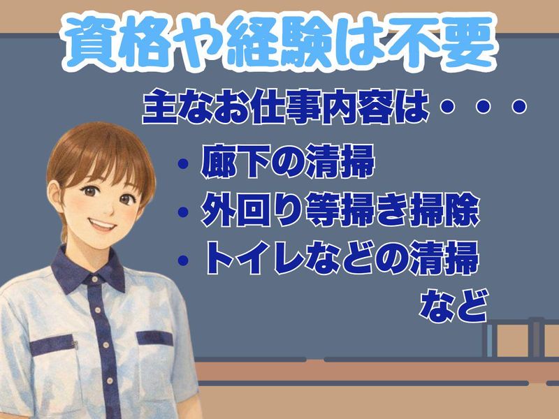 仕事内容 学校用務のお仕事 具体的には・・・ ・来客対応 ・校内の清掃 ・花壇のお手入れ など。 特別な知識や経験がなくても日常的な業務となります。 担当社員や先輩が丁寧にサポートしますのでご安心下さい。 清掃経験のある方は、 清掃経験を活かして働いていただけますので大歓迎。 子供達や地域の方々にとって必要不可欠な学校を綺麗に保つ 為にかけがえのない地域貢献度高いお仕事です。 ゆくゆくは、現場の責任者として学校と担当社員との懸け橋としての 役目も果たして頂きます。