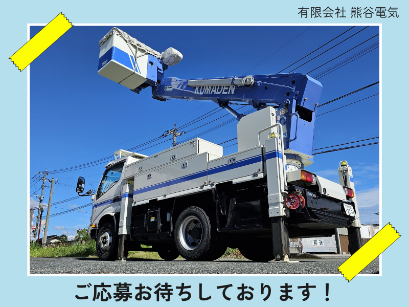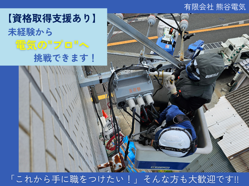 仕事内容 / 弊社では、電気工事士として 一緒に働いてくれる仲間をを募集しています! これから資格取得を目指したい方や 実務経験が全くない方も大歓迎です! \ ・・・・・・・・・・・・・・・・・・・・・・・・・・・・・・・・・・・・・・・・・・・・・・・・・・・・・・ ⭐当社のこちらのHPをぜひご覧ください⭐ 詳しい事業内容や会社情報などを公開しています。 会社の雰囲気や一緒に働く仲間の人柄を感じられるかもしれません! 【会社HP】 https://kumagaedenki.com (※リンクをコピーしてブラウザやアプリ等でご覧ください) ・・・・・・・・・・・・・・・・・・・・・・・・・・・・・・・・・・・・・・・・・・・・・・・・・・・・・・ 【 お仕事内容 】 電気の配線工事や設備設置、改修などの 電気工事を行います。 色んな現場を回るお仕事なので、 新しい現場や作業内容なども 毎日変化があり、退屈しませんよ! まずはできることからお任せします! 現場は体力仕事と思われがちですが、 そんなことはありません! “コツ”を掴めば、簡単です! 先輩が作業のコツから丁寧に教えます! 未経験でも安心して来てください! 当社は、一般の電気工事のお仕事をはじめ、 高圧工事や電線の敷設・配線や配管、回路増設、 アンテナ工事、照明器具取替、 太陽光設備工事など幅広い案件に対応しています! 筑前町の事務所へ出勤後、社用車で現場へ向かいます! 状況によっては直行直帰もOKです。 又、今後、会社情報をSNSで発信できればと考えていますので SNS等に興味のある方も歓迎です! ┏━━━━━━━━━━━━┓ ✨先輩スタッフからの一言✨ ┗━v━━━━━━━━━━┛ 未経験者の方は先輩がサポートしますので、 不安な事があれば気軽に頼ってください。 手厚いサポート(各種手当で月給+αを実現)で応援します! 若手の育成にも力を入れて考えていますので 電気工事に興味がある方で 「これから手に職をつけたい!」なんて方も歓迎です!