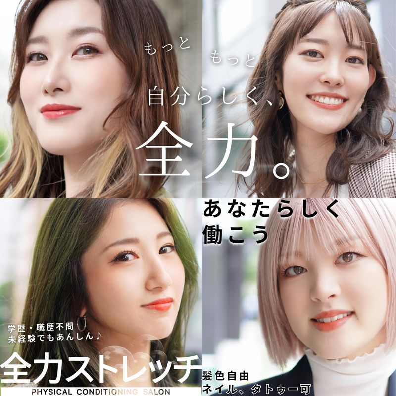 求めている人材 ⭐こんな方にオススメ⭐ ・「ナイトワークから昼職へ転職したい」方 ・「シンママだけど安定収入と高収入の両方が欲しい」方 ・接客のプロとしてコミュニケーション力や気配りスキルを活かしたい方 ・「美」に関わる仕事がしたい方 ・「本格ストレッチ」に関心がある方 ・コミュニケーションを取るのが好きな方 ・夢や目標がある方 ・未経験者歓迎 ・同業界の経験者歓迎 ・無資格OK ・接客業のブランクOK ・副業・WワークOK ・学歴不問 ・フリーター歓迎! <異業種・異職種からの転職者多数在籍> こんな経験をしてきた方は経験を活かせますよ ・ヨガ、ピラティスのインストラクター、パーソナルトレーナー、スポーツジム受付、ダンサーなど体を動かすお仕事 ・各種ナイトワーク(クラブ、ラウンジ、キャバクラ、バー、スナックなど)のフロアスタッフ、ホールスタッフ、カウンターレディ経験ある方 ・美容部員、アパレル販売員、コンビニ店員、飲食店店員、カラオケ店員などの接客のお仕事 ========== <スタッフインタビュー> ▶「全力ストレッチ」で働く魅力は?  ̄ ̄ ̄ ̄ ̄ ̄ ̄ ̄ ̄ ̄ ̄ ̄ ̄ ̄ ̄ ̄ ̄ ・なんといっても業界内1の高給 ・頑張りがお給料にしっかり反映される ・手に職がつく ・「元気をもらいに来たよ」「これからも体を任せたい」とお客様に言ってもらえる ・好きなものにお金を使える(洋服・鞄・コスメ・推し活・旅行など) ・自分に自信が持てるようになる ・自分の体のケアができるようになる ・シフト自由でプライベートも充実できる ・様々な人と出会えて人脈が広がる