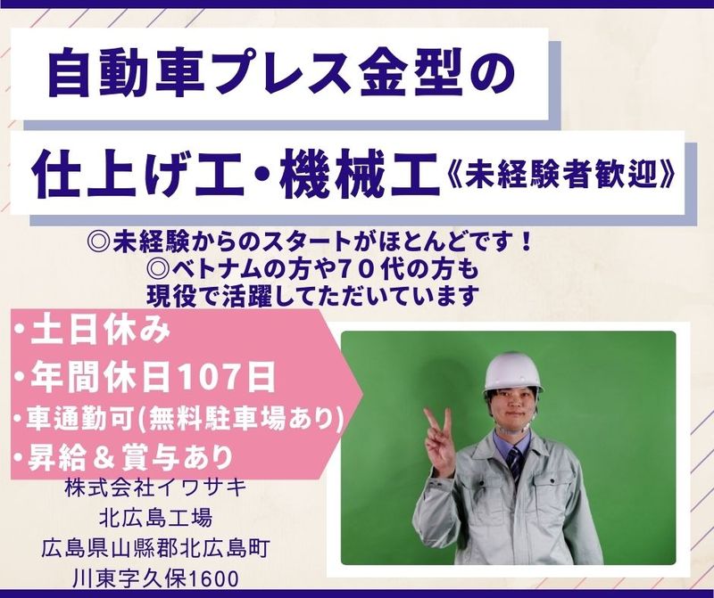 メッセージ ◆―――――――――――◆ 株式会社イワサキ 北広島工場は ・広島県北(北広島町)に位置し 中国山地の豊かな自然を 四季折々感じる事が出来ます ◆―――――――――――◆ =============== 少しでも気になった方は 会社説明・見学からスタートOK! 一緒に学びながら 「モノづくり」にチャレンジしてみませんか? =============== 【お仕事のやりがい】 ・各部署20人ほどが働いており ベトナム人の実習生や 70代の方にも 活躍していただいております! ・未経験スタートの方がほとんどで 前職は営業・販売・建築など 様々な経歴を持った方が働いています ▽▽▽▽▽▽▽ ☆こちらのお仕事は、 企業様からお預かりし 転職エージェント『しごと計画学校』が ご紹介するお仕事です ※応募先は『しごと計画学校』となり 雇用先は紹介先の企業様となります 『しごと計画学校』については 下記「その他欄」に記載しておりますので ご参考ください 少しでも気になった方は会社説明・見学からスタートOK!「モノづくり」にチャレンジしてみませんか? 職業紹介事業(33-ユ-300208) 労働者派遣事業(派33-300443)