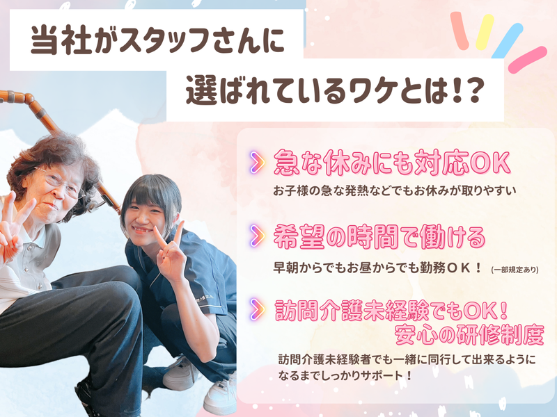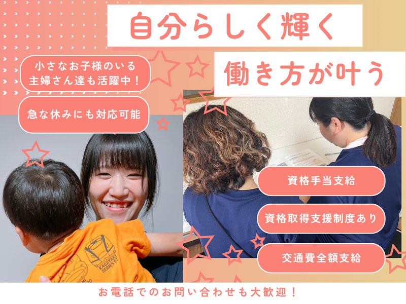 仕事内容 \定員9名の少人数デイサービス/ 業務にせかされることなく、 自分のペースで利用者様に 寄り添える環境です。 生活相談員および機能訓練指導員として、 チームで施設運営を支えていただきます。 【主な業務】 ・利用者様やご家族との相談対応 ・通所計画の作成や 関係機関との連絡調整 ・機能訓練の計画サポートや見守り ・健康状態の確認や日中の見守り ・スタッフ間の情報共有、チームケア ※定員9名の小規模施設のため 一人ひとりに寄り添った支援が可能です ※業務量に追われる環境ではなく 落ち着いて働けます - お電話でのお問い合わせも大歓迎! TEL:090-1759-2255(採用担当まで) - ―――――――――――――――――― 【 仕事内容 】 ―――――――――――――――――― 少人数制デイサービス「星の香り」にて 生活相談員兼機能訓練指導員としての 業務をお願いします。 日中の見守りや活動サポートなど、 スタッフと協力しながら 現場にも関わっていただきます。 【主な業務】 ・相談対応や連絡調整 ・機能訓練の見守りやサポート ・レクリエーションのフォロー ・チームでのケア、情報共有 ※身体的な負担は比較的少なめです ※チームで協力しながら進める環境です ―――――――――――――――――― 【 勤務先 】 ―――――――――――――――――― デイサービス星の香り ―――――――――――――――――― 【 1日の流れ/例 】 ―――――――――――――――――― 8:30 出勤・朝礼/ご利用者様の送迎出発 ・相談内容や機能訓練予定の共有 9:30 バイタルチェック・健康状態の確認 ・利用者様の様子確認、日中の見守り 10:00 個別対応・体操・活動サポート ・必要に応じご家族や関係機関との連絡調整 11:30 昼食準備・見守り 12:30 休憩(交代制) 13:30 レクリエーション・体操など ・機能訓練のフォロー ・相談対応や通所計画の調整(チームで対応) 15:00 おやつ提供・リラックスタイム 16:00 帰りの準備・送迎出発 17:00 記録作成・情報共有 ・通所計画の確認や関係機関との調整 17:30 退勤 ※勤務時間に応じて 業務をお願いしています。 ―――――――――――――――――― 【 職場の特徴 】 ―――――――――――――――――― ◎ 定員9名の小規模施設 ◎ 利用者様との距離が近い ◎ ゆったりした時間の流れ ◎ チームワーク重視 流れ作業ではない、 利用者様に寄り添える介護ができます。 ―――――――――――――――――― 【 求める人物像 】 ―――――――――――――――――― ・小規模施設で落ち着いて働きたい方 ・利用者様とじっくり関わりたい方 ・チームワークを大切にできる方 穏やかな環境で長く働きたい方歓迎です。