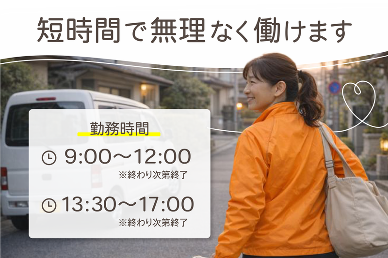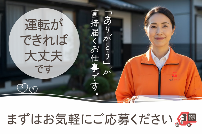 求めている人材 要普通免許(AT限定可) スピードは不要です、安全に運転できる方 *未経験・ブランクOK *年齢不問 *30代~70代の主婦さん中心に活躍中! *扶養内勤務OK <こんな方には特におススメです♪> ★「人と話すのが好き」な方 お弁当をお渡しする時に ちょっとした世間話を。 「今日もありがとうね」と 笑顔で迎えてくれる方ばかりで 自然とこちらも笑顔になっているお仕事です。 ★「決まったルートが安心」する方 毎回同じルートだから、道に迷う心配もナシ。 運転に集中しながらも、 だんだん街の顔なじみが増えていくのも楽しいです! ★「家事の合間にリフレッシュ」したい方 午前のみ:残業なしで午後からは家事、お出かけも。 午後のみ:朝の家事を済ませてから、ゆっくり出勤。