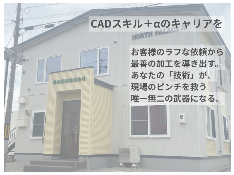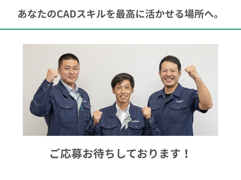 求めている人材 \CADの実務経験を最大化したい方歓迎!/ 《必須条件》 ・普通自動車免許 ・CADの実務経験がある方 (設計や図面作成の経験者) ※営業経験は一切問いません。 〈使用ツールについて〉 現在は「JW_CAD」や 「CADSUPER Lite」を メインに使用しています。 ただ、ソフトはあなたが使い慣れた ものに柔軟に合わせます! 「これが使いやすい」という 希望があればご相談ください。 《歓迎条件・経験》 ・周囲と助け合う協調性がある方 ・自ら学ぶ姿勢のある方 ・新しいことに挑戦したい方 ・仲間と協力して働きたい方 ⏩活躍中の先輩の前職をご紹介!⏩ 鉄工所の設計、建築製図、 機械設計 など。 ⭐ここがポイント!⭐ ┈┈┈┈┈┈┈┈┈┈┈┈┈┈┈┈•• ✅CAD専任の初ポジション! あなたの経験が基準になります ✅営業同行を通じて、 「技術営業」へと着実な進化 ✅基本土日祝休み&残業少なめ。 ワークライフバランスも確保! ✅冬季燃料手当など、 北海道で暮らす安心をサポート ■採用担当者より ┈┈┈┈┈┈┈┈┈┈┈┈┈┈┈┈•• 当社のCAD職は、 単なるサポート役ではなく、 会社の利益を生む「攻め」の ポジションです。 技術を磨き、現場を動かし、 結果を出す。 その分、報酬や達成感として しっかり還元していきます。 本気でスキルアップしたい。 そんなあなたの挑戦を、 全力でサポートします!