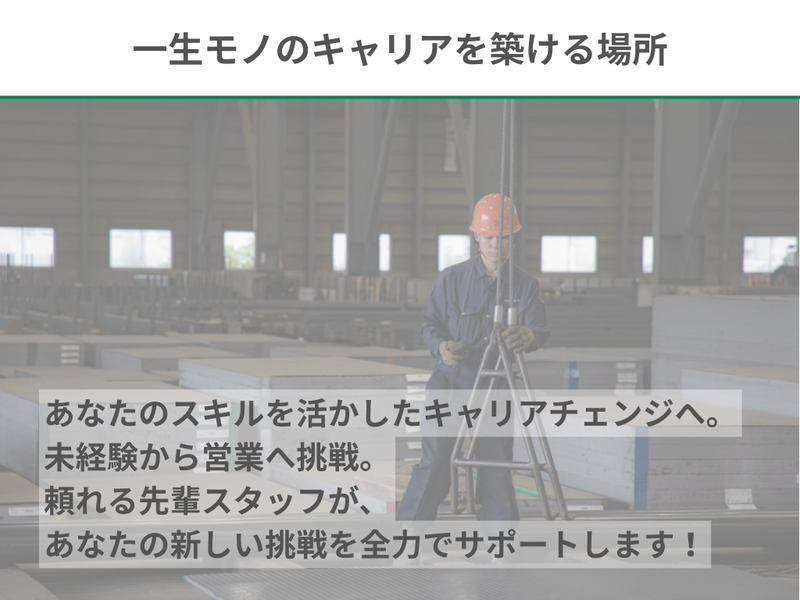 仕事内容 「CADの経験はあるけれど、 指示通りに図面を 作成するだけの日々」 「今のスキルを活かして、 もう一歩上の キャリアを目指したい」 そんな想いを持つあなたへ。 当社でしか経験できない、 【CADスキル+α】の 新しい働き方を提案します! ✨栄和鋼業株式会社の魅力✨ ✅あなたのCAD実務経験を 最高の「武器」に変える ✅「設計×営業」のハイブリッド。 市場価値が圧倒的に高まる ✅月給最大46万円+ 年3回の賞与チャンス! ✅ツールは自由! 使い慣れたソフトで仕事ができる ✅原則転勤なし。 地元で腰を据えて成長できる *‥‥*‥‥*‥‥*‥‥*‥‥*‥‥* お任せしたいのは、 鉄工所や建設会社様から届く 依頼をもとにした、 加工図面の作成や提案です。 単なる「作業」ではありません。 あなたのCADスキルを使って、 現場のプロたちの 「困った」を解決する仕事です。 まずは、技術営業の先輩スタッフの アシスタントからスタート。 CAD業務を中心に、 少しずつ「提案のコツ」を 伝授していきます。 ゆくゆくは、 図面が引ける強みを活かした 【技術営業】へ。 CADのプロから、提案もできるプロへ。 着実なスキルアップを お約束します!✨ ■ CAD経験者が実感する当社の魅力 ┈┈┈┈┈┈┈┈┈┈┈┈┈┈┈┈┈┈•• ✅ 【スキルの化学反応】 培ったCAD技術と 新しい商品知識を掛け合わせ、 現場の「最適解」を 自らの手で生み出す。 そんなワクワクを 強く味わえる仕事です! ✅ 【作業から「提案」へ】 お客様のラフな依頼から 最善の加工方法を考え、 技術で新しい価値を創る。 ただ指示通りに なぞるだけの作図とは違う、 手応えがここにあります! ✅ 【エリア屈指の好待遇】 培ってきた技術に見合う 正当な対価を、 しっかりとお約束します。 ・月給24万円〜46万円保証 ・住宅手当や家族手当、 役職手当もしっかり完備。 ・北海道の冬に嬉しい! 冬季燃料手当を毎年支給。 ・昇給年1回、賞与年2回にプラス、 期末賞与もこれまで欠かさず支給。 ✅ 【地元で長く働ける環境】 ・原則転勤なし ・基本土日祝休み (3週に1度土曜午前出勤あり) (8:00~12:00) ・車通勤OK&無料駐車場完備 ・効率重視で残業は少なめ! ■ 実際のお仕事内容 ┈┈┈┈┈┈┈┈┈┈┈┈┈┈┈┈•• お客様からの依頼をもとに、 専用CADでの図面作成、 見積作成、製作元への 加工指示出しをお任せします。 最初は先輩スタッフの アシスタントとして、 図面作成業務を中心に スタート。 現場の知識や商品の特徴を 学びながら、徐々に実務に 慣れていきましょう。 ゆくゆくは営業スタッフとして、 お客様の担当もお任せしていきます。 ■教育体制 ┈┈┈┈┈┈┈┈┈┈┈┈┈┈┈┈•• 【入社後〜3ヶ月】 まずは倉庫での実務から。 出荷作業(荷出し)を通じて、 鋼材の種類や名前を じっくり覚えていきます! 実際の鋼材に触れ、 図面上の線が何なのかを 深く理解する期間です。 【4ヶ月目〜1年】 営業スタッフのアシスタントとして CAD業務や電話対応を担当。 会社のシステムや 仕事の流れに慣れていきます。 【1年~】 徐々に営業に同行し、 「提案」のノウハウを習得。 CADのプロから、 提案のプロへ進化しましょう! ■ 先輩スタッフのインタビュー ┈┈┈┈┈┈┈┈┈┈┈┈┈┈┈•• 前職は鉄工所の設計業務などを 担当していました。 30歳の時に挑戦したのが、 CADがわかる営業! 現場の意図を汲んで 「こうしましょう!」と提案する この+αの動きが、 お客様から高く評価されています! 正直、人見知りな自分に 営業ができるのか、 不安もありました(笑) でも、自分のスキルを活かして 新しいキャリアが 開けて本当によかったです! ■当社について ┈┈┈┈┈┈┈┈┈┈┈┈┈┈┈┈•• 栄和鋼業株式会社は 一般鋼材や各種高圧ガスを 専門に扱う商社として、 地域のモノづくりを支えています。 最大の強みは、 「自社ですべて完結できる」 という圧倒的な対応力です。 自社倉庫に豊富な在庫を持ち、 加工センターも完備。 さらに、自社配送チームによる スピーディーな納品体制を 整えています。 「困った時は栄和鋼業さん」 そう頼っていただける 確かな信頼関係こそが、 私たちの誇りです。