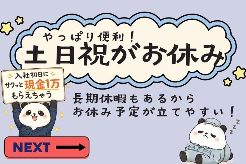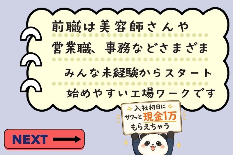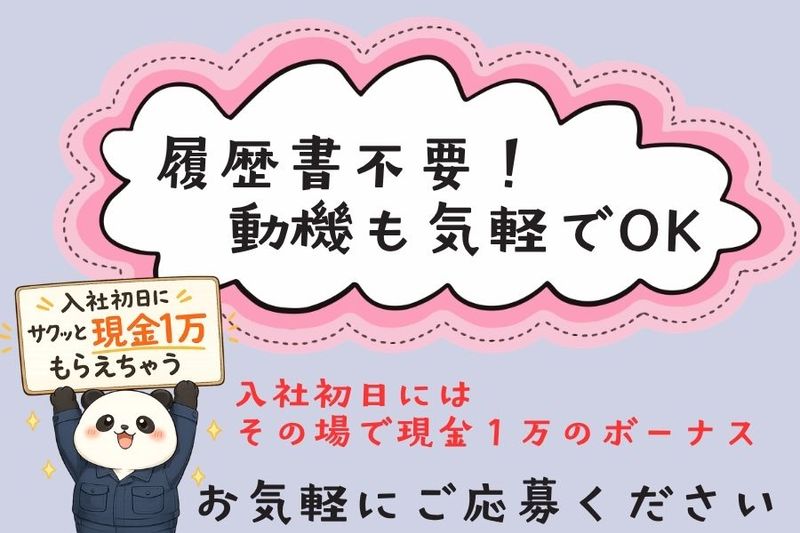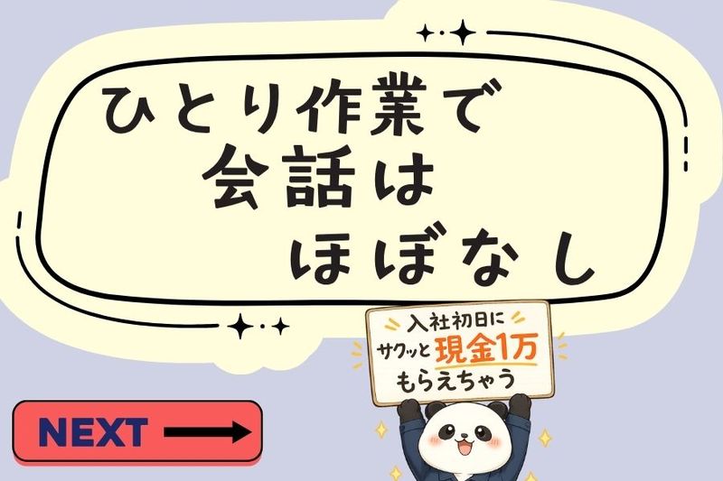 アピールポイント: // 入社時の特別支給「サクッと1万」開始 入社初日に「入社特典」をゲットしよう! 配属されたその場で「現金1万円!」 気になったらお気軽にお問い合わせください! \\ ・未経験OK ・20代~40代男女活躍中 ・初日から時給1500円 ・残業/深夜は割増時給1875円 ・1人モクモク作業 ・車・バイク・自転車通勤OK ・明るい茶髪可 ・ショートネイルOK ・作業服貸与 <日払い・週払い利用OK> \まるで毎日が給料日/ \\利用者急増中// \アプリで簡単申請/ お気軽にご相談くださいね!