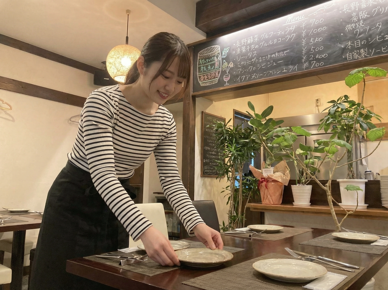 仕事内容 《大学生・20代女性スタッフ多数活躍中》 『かわいいお店で働きたい!』 『バイトも楽しく選びたい』 そんな子にぴったりのお仕事です◎ 善光寺すぐの人気イタリアンで 未経験から安心スタート♪ 《このバイトの魅力!》 ◎ 週2日〜/1日3h〜OK ◎ 学校優先シフトOK! ◎ 髪色・ネイル・ピアスOK(規定あり) ◎ まかないあり! ◎ 未経験スタート多数 ◎ 女性スタッフ中心に活躍中! ◎ 車通勤・バイク通勤・自転車通勤可! 《仕事内容》 ホールのお仕事をお任せします♪ 【主な業務内容】 ・お客様のご案内 ・オーダー取り(タブレット・紙) ・料理・ドリンクの配膳 ・お会計(レジ) ・簡単な洗い物作業 ・片付け・簡単な店内清掃 ・簡単なキッチンのサポート *難しい専門知識はいりません *先輩が近くでサポートします◎ 《未経験でも大丈夫な理由!》 ・マニュアルあり ・横について教えます ・失敗してもフォロー体制あり 実際にバイト未経験 スタートがほとんどです! 《シフト例》 ・学校帰り → 17:00〜21:00 ・空きコマ → 12:00〜15:00 ・土日だけ → 11:00〜17:00 ▶テスト期間・帰省も調整OK! 《ここで働くメリット》 ・接客マナーが身につく ・コミュ力アップ ・就活のアピール経験になる 『このバイトやってて良かった』 という声を多数いただいてます♪