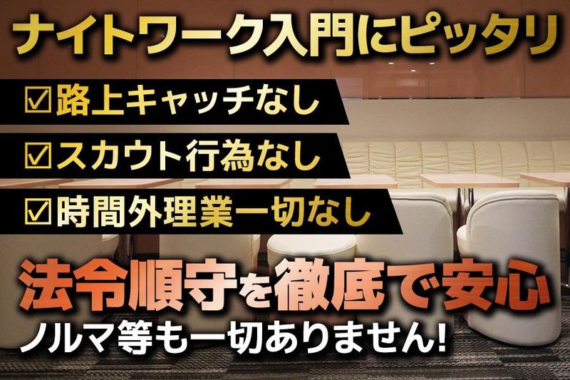 職場環境 大手グループ法人が運営で安心! 待遇面の充実だけではなく、 当然法令順守を徹底しているグループ企業なので、 ✅路上客引き行為(キャッチ) ✅25時以降の時間外営業 ✅スカウト行為 ✅給与のごまかし などの ナイトワーク特有のグレーな面は一切ありません✨