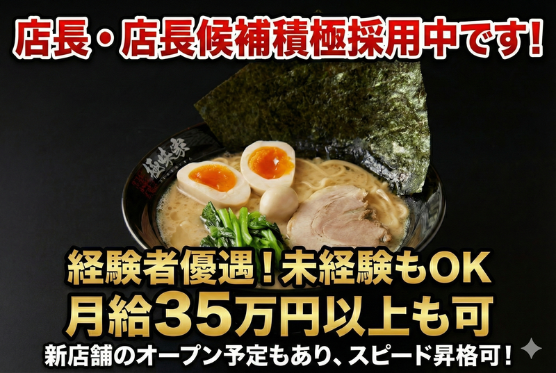 仕事内容 【仕事内容】 売上管理・具材の発注や納品管理・スタッフ管理(採用・教育)から、接客・調理補助まで、店舗運営の業務全般をお任せします。 【アピールポイント】 ✅<経験者優遇!未経験もOK> ラーメン店はもちろん、居酒屋・カフェなど飲食店での店舗管理・店舗運営の経験者をお持ちの方優遇いたします!また、充実した研修がありますので、異業種からのチャレンジや未経験スタートも大歓迎です。 ✅店舗拡大中!スピード昇格が可能 株式会社ジョイフードは、神奈川県・東京都・埼玉県に『横浜家系ラーメン極味家(きわみや)』を6店舗展開中!今後も各地でオープン予定があり、店舗数の増加と共に採用ポジションが増え、店長へ昇格のチャンスが増えてます。 ✅<オンライン面接OK!> もちろん来店での面接もOK!ラーメンもご馳走しますよ。 ≪昇格事例/職位別給与(目安)≫ ・~3ヶ月(研修)/月給29.9万円~33.1万円 ・6ヶ月目(店長)/月給35万円~40万円 ※基本給+インセンティブ・残業代(45時間相当分)を含む