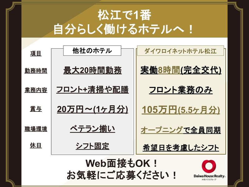 仕事内容 ┏━━━━━━━━━━━━━━━━┓ \8月松江駅徒歩2分に新規オープン!/ ┗━━━━━━━━━━━━━━━━┛ ✅賞与年113万2千円支給!(2025年度実績5.9ヶ月分) ✅育休取得率80%以上!有給取得率80%以上! ✅毎月、希望休を考慮したシフト組み! ✅フロント業務メインで残業もほぼなしの環境! ✅正社員登用実績90% ✅未経験9割!松江を一緒に盛り上げてくれる方募集! 松江駅前の新しいシンボルになる ダイワロイネットホテル松江で働きませんか? 〜ダイワロイネットホテルのここが魅力!〜 ⭐圧倒的な賞与の高さで還元! 1年目からボーナス支給! 平均支給額113万2千円!年収344万円〜! 頑張りを給与にそのまま還元! 「欲しかったSUVを新車で購入しました!」 「毎年長期休暇は海外旅行へ!」 など私生活も仕事も充実している方多数! ┏━━━━━━━━━━━━━━━━━┓ ◆「不規則」を「自由」に変えるシフト ◆ ┗━━━━━━━━━━━━━━━━━┛ 弊社では、負担にならないように その方に合わせてなるべく早番多めや遅番多めなど 個別調整して働きやすい環境を整えています。 ◆1週間のシフト早見表(例) ◆ 【 月 】☀️ 早番 | 07時 〜 16時 【 火 】🌙 遅番 | 13時 〜 22時 【 水 】🌙 遅番 | 13時 〜 22時 【 木 】⭐ 休み | ー OFF ー 【 金 】🌌 夜勤 | 22時 〜 翌07時 【 土 】⭐ 休み | ー OFF ー 【 日 】🌙 遅番 | 13時 〜 22時 ⏰ シフト時間帯の目安 ☀️ 早番 ⏩ 07:00 〜 16:00 🌙 遅番 ⏩ 13:00 〜 22:00 🌌 夜勤 ⏩ 22:00 〜 翌07:00 ⭐ 休日 ⏩ リフレッシュ!✨ ※基本的に希望の日を4日ほどお休みに出来ます! ※「明け休み」+「公休」で連休気分♪ (仕事が終わったその日+翌日の休みで、実質1.5〜2.5連休のような感覚です) ┏━━━━━━━━━━━━━━┓ ◆ホテルフロントに集中できる環境 ◆ ┗━━━━━━━━━━━━━━┛ オープニングなので煩わしい人間関係は「ナシ」 一緒にエリアで1番のホテルを作りましょう! ◆ お仕事内容 ◆ お任せするのはフロントのお仕事 掃除や食事の配膳などもございません。 負担を少なくするために環境を整備しています。 ・チェックイン・アウト対応 ・宿泊予約の受付・管理(電話やWeb) ・館内案内や松江の観光スポット紹介 ・備品管理やカンタンなデータ入力 マニュアル完備で先輩社員がトレーナーとして 丁寧に教えますので安心してくださいね! ┏━━━━━━━━━━━━━━┓ ◆オープンまでは近隣ホテルを予定◆ ┗━━━━━━━━━━━━━━┛ 会社負担で旅行のような気分でスキルを磨けます! オープンまでは中四国エリアのホテル(広島・岡山など) での研修勤務となります。(宿泊費等会社負担) お休みの日は観光はもちろん 近隣の県なので休日は島根に帰省も出来ます。 すぐ働きたい場合や在職中でいつに入社したいなど 入社日に関してもご相談ください。