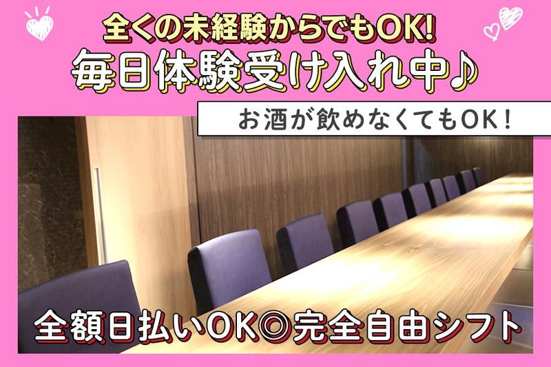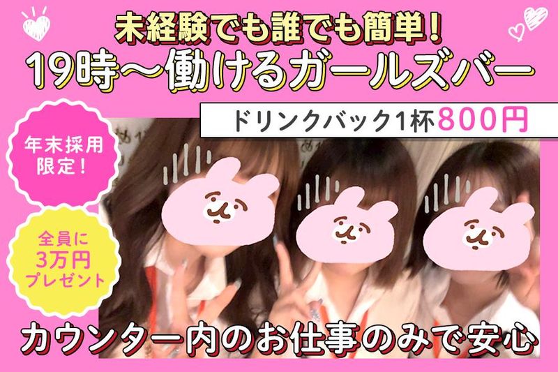 時給4,000円以上 給与詳細 基本給:時給 4000円 〜 入店するなら今がおすすめ! 年末に向かってお客さんが多くて 入店する同期も多い今が入店に最適✨ 今なら『入店した子全員に3万円プレゼント』 制服や靴は全てレンタルできるので、 手ぶらで出勤できます♪ 応募したその日の稼ぐことも可能です⭐ ⭐ドリンクバック1杯800円 ⭐深夜1時以降500円UP(時給4,500円~) など超嬉しい待遇が多数✨ ✅がんばり次第でいつでも昇給 ✅日払い&手渡しOK ✅各種高額バックあり ┣ボトル,フード…20% ┣ドリンク…1杯800円 ┗他あり その他にも ✅体験入店毎日受付中 ✅お友達紹介特典 1人につき5万円 ✅応募したその日に働ける ✅終電までOK ✅履歴書不要 ✅送り無料 ✅制服/靴レンタル無料 ✅ヘアメイク無料 ⭐⭐ 体験入店大歓迎! ⭐⭐ ※体験時間は相談可能です! ※シフトの関係上、「お仕事体験」ができない日もあります。 Q.一緒に働く女の子の雰囲気を知りたい! Q.お客さんの層を知りたい! Q.制服を着てみたい! Q.未経験だからまず試したい! Q.スタッフさんの雰囲気を知りたい などなど… 質問や相談ベースの体験も大歓迎です! やってもらうことは、 ◆簡単なお酒作り ◆カウンター内でお客様とお話し 以上!! 楽しく、体験してみてください! 未経験を中心にお店を運営してるので、 初心者さんでも安心してくださいね♪ 先輩もみんな未経験からです! だからトークスキルや接客スキルはなくて大丈夫! ソフドリも豊富でお酒が得意じゃなくてもOK 年末までの短期で相談したい!など すぐに働けない方も今のうちに面接だけする!もOKです⭐ 【給与例】 給与例 法令順守のガールズバーですが キャバクラ並みの稼ぎも可能です! 「今月結構支払いが重なっちゃうからヤバいかも…!」 なんてピンチの時もお給料の“日払い”が可能なので、 出勤すればその日のうちにお財布の中身を満たせます⭐