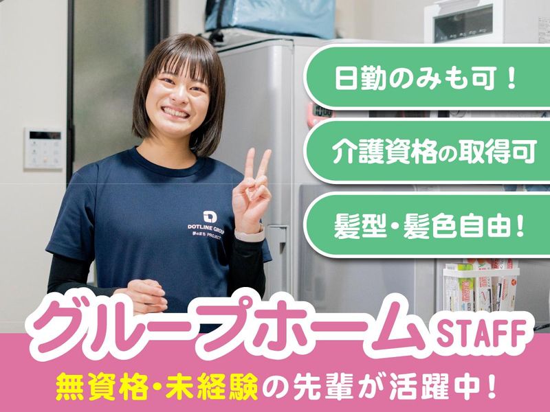仕事内容 ⭐ー⭐ 社員の8割は20~30代♪ 女性が多めの職場です。 介護・福祉業界の経験は不要♪ 接客業や人と関わる仕事の経験が ある方が多数在籍しています ⭐ー⭐ ⏩徹底したマニュアルを完備! なにか困ったときは先輩もいますし、 マニュアルにも記載していますので 未経験の方も安心スタートできます。 ⏩日々の頑張りはしっかり評価。 年4回の人事評価制度に基づいて 評価を行っています。 ⏩介護系の資格取得可能! 「この年から福祉業界に挑戦したい…」 「誰かの役に立てる仕事がしたい」 そんな想いのある方にも♪ ー <✅お仕事内容> 軽度の精神障がいを持つ 入居者様が4~6名で生活する グループホームでのお仕事です♪ 安心して暮らせるよう支援や ご家族へのサポートをお願いします。 【具体的には…】 ◇朝・夕食準備 ▶ガッツリ調理…ではなく、 湯せんやレンジで温めたりする 程度なので安心 ◇掃除 ▶ 共用部や居室の簡単なお掃除。 ほこりをサッと拭いたり、 掃除機をかけたり。 ご家庭でのお掃除の延長線上でOKです。 ◇洗濯 ▶ 洗濯機の操作や洗濯物を 干したりたたんだり。 たたんだ洗濯物を所定の場所に戻す お仕事もあります。 ◇入居者様の送り出し ▶ 「いってらっしゃい!」の お声がけや、必要に応じて 身だしなみのチェックなど。 その日のスタートを気持ちよく 迎えられるよう、 さりげなくサポートします。 ◇入居者様のサポート ▶ 日常のちょっとしたお手伝いや、 お話相手になっていただくことも。 ◇事務業務(書類作成・整理、請求管理、物品管理等) ▶ 簡単なパソコン入力やファイリング、 物品のチェックなど。 ⭐夜間の巡回の時間の目安は、 22:00/02:00/05:00です。 施設は複数連なっており 隣の施設も巡回していただきます。 ⭐夜勤帯はご利用者様もお休みの時間。 基本的に落ち着いた時間です。 【お仕事の流れ/日勤例】 09:00 出勤・申し送り確認 朝の掃除や洗濯 利用者さんの送り出しや 身の回りのサポート 11:00 書類整理や事務作業 ちょっと一息♪ 12:00 お昼の準備・配膳サポート 食後の片づけ 13:00 利用者さんのサポート (話し相手になったり、 ちょっとしたお手伝いなど) 空き時間には簡単な事務作業 15:00 おやつタイムの準備・サポート 16:00 夕食準備(湯せんや温め、盛りつけなど) 夕食後の片づけ 17:30 引き継ぎ・記録の記入 18:00 終業 おつかれさまでした♪ 【お仕事の流れ/夜勤例】 22:00 出勤 巡回・配薬 朝ごはんの準備 利用者さんの対応 待機 02:00 巡回 待機 05:00 巡回 配薬と利用者さんの対応 07:00 終業 ・―・・―・・―・・―・・―・・―・・―・・―・・―・・―・ ✅ドットライングループの "ワンストップサービス"はココがすごい! 訪問だけでなく、通所や入居の支援も提供し 利用者のニーズに合わせたサービスを 自社内で一貫して提供しています。 これにより、訪問看護にとどまらず、 様々なキャリアパスの選択が可能になり 将来の展望が広がります!! 事業所200ヶ所、従業員2000人の規模で、 企業としての安定性も抜群◎ 一生涯にわたるサポートが可能なので 利用者に寄り添ったケアを提供できます。 大きなやりがいを感じながら 働ける環境が整っています♪ 【ドットラインってどんな会社?】 『地域の「困った」を 「ありがとう」に変える』を スローガンに、医療・福祉・保育・ 教育・介護事業を展開しています。 千葉県を中心に 26事業200拠点以上を展開し、 地域包括ケアシステムの実現をする為、 事業の多角化、グループ内展開を 推進しています。 【ドットホームの想い】 障がいのある方々に自分らしく、 安心して暮らしてほしい。 そんな"第二の自宅"である ドットホームは、利用者一人ひとりの ニーズに寄り添い、サポート体制を 充実させることで、 自立した生活ができるよう 支援しています。 ・―・・―・・―・・―・・―・・―・・―・・―・・―・・―・ ✨転職をお悩み中の方はこちら!✨ \*会社説明会随時開催中*/ *履歴書不要! *スーツ着用不要♪私服OK *質問はNGなしでお答えします! ~こんなお悩みがある方は今すぐ参加!~ ・話しは聞いてみたいけど、履歴書や 職務経歴書を準備する時間がない。 ・福祉分野に挑戦したいと思いながら、 踏み出すのをためらってしまう。 ・時短勤務で働きたい。 土日休みで働きたい。 でも、面接で相談しづらい…。 もちろん「話を聞いてみたいだけ!」 という方も大歓迎♪ よくある質問をチェック! ✅残業や休日について ✅どんな利用者さんが多いの? ✅他の施設との違いは? ✅どんなスタッフが働いているの? 職場の雰囲気は? ✅研修制度、資格取得支援などの バックアップ体制は? 説明会ではドシドシご質問を お受けしております! お申し込みはコチラ!! https://recruit.dotline-jp.com/ ※上部の「説明会予約」をクリック! \ぜひ、お気軽にご参加ください♪/ ・―・・―・・―・・―・・―・・―・・―・・―・・―・・―・