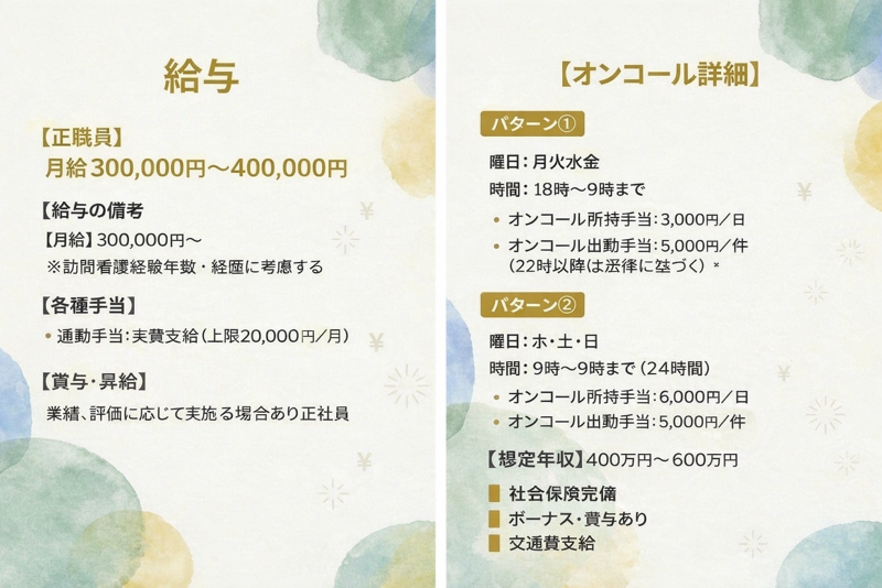 仕事内容: 皆さんは、どうして「看護師さん」になりましたか? はじめまして! コレゾ訪問看護ステーションの齊藤と申します! 少しだけ私の自己紹介と訪問看護ステーションの開業経緯についてお話させていただきます! 私は、もともと「食」に興味があり、食べることや料理をすることが大好きで、「食から身体を整える・治す」という考え方に強く惹かれ、調理や栄養を学ぶために高校へ進学し、栄養士の資格を取得しました! その後、1000床以上ある大学病院で栄養士として勤務しながら、管理栄養士の資格を取得し、約7年間、病院で働いていました。 今、看護師として働いている皆さんとは、少し違った道を歩んできたかもしれませんが、 管理栄養士として働いた後に、27歳で看護学校へ入学し、正看護師の資格を取得しています。 なぜ、管理栄養士から看護師になろうと思ったのか。 それは、病院の中で「患者さんの役に立てること」に、限界を感じたからなのです・・ 私たちは、患者さんの最期を看取ることはできず、病室での生活の中で、人と人として深く関わる場面も少なく、なんとなく、どこか力不足を感じていました。 看護師の皆さんにとっては当たり前かもしれませんが、栄養士の立場から見ると、 看護師の「患者さんとの関わり」や「療養支援」は、チーム医療の中でも本当に大きな役割を担っていると感じています。 なんとか看護学校を卒業し、正看護師の資格を取得した後は、「がん患者さんの支援をする」と心に決めていたので、東京都内のがん専門病院へ入職しました。 現在、私たちの訪問看護では、9割以上の利用者さんが「精神疾患」や「知的障害」をお持ちですが、今後、より幅広い支援ができる体制も、皆さんと一緒に整えていきたいと考えています! がん専門病院には5年間勤務し、その後は、ホスピス型の有料老人ホームや、在宅診療所に併設された訪問看護ステーションでの経験を積みました。 皆さんも経験あるかもしれませんが、これまでで特に辛かったのは、ALSの患者さんの支援に関わったときです。ご利用者の強いご要望に応えられず、「私のやりたい看護って何だろう…」と、看護師として本気で悩み、壁にぶつかったことがありました・・ また、近年の訪問看護ステーションでは「売上」が重視され、1日の訪問件数が8件以上という現場も少なくありません。 一人ひとりの利用者さんと、丁寧に向き合えない「訪問看護の現状」に疑問を感じ、改めて「訪問看護の役割とは何だろう」と考えたことで、儲かること優先するのではなく、本当に“利用者さんファースト”を実現できる訪問看護ステーションをつくりたいと思い、2025年に思い切って開業しました! なので、ステーション名も「コレゾ訪問看護ステーション」なんです。 私たちは、大田区・目黒区・品川区を中心に、「小さく、丁寧に」を大切にしています! 「丁寧」や「大切」という言葉は、利用者さんだけではありません。一緒に働く職員さんが、看護師として長く仕事を続けられるように、正社員は【週休3日制】を導入しました! また、パート・アルバイトの方は、週1回からの勤務、副業OKとし、全員共通で「直行直帰」ができるなど、“働きやすさ”も大切にした環境を整えています! 未経験の方、ブランクのある方、私のように異業種から看護師になった方、今あるスキルを存分に活かしたい方、プライベートと両立しながら働きたい方、どんな方も、座学やOJTを通じて、学ぶ機会を準備しています! まずは一度、事務所に遊びに来てみませんか? お会いできるのを、心から楽しみにしています!! 必ず会いましょう! ぜひ会いに来てください!! コレゾ訪問看護ステーションは、利用者さんの9割以上が精神疾患・知的障害をお持ちの方です。症状だけを見るのではなく、その人の人生や背景に寄り添う看護を大切にしています! 訪問件数に追われるのではなく、一人ひとりと丁寧に関わる体制だからこそ、信頼関係を築きながら支援ができます。精神看護が初めての方も、経験を深めたい方も、「人と向き合う看護」を実践できる環境です! 末永く、ご利用者を支援できるように『ご利用者さんの人生の応援団として』 ぜひ皆さんの力をお貸しください!! 【 業務内容 】 ご利用者さんの自宅を訪問し、医師の指示書に基づいた訪問看護を精神疾患、難病、認知症、がん末期など、幅広く提供します! ・訪問エリア 大田区・目黒区・品川区 ・訪問手段 電動自転車(社用自転車を貸与) ・1日あたりの訪問件数:3~5件程度 【主な業務内容】 ・バイタルサインのチェック、服薬管理 ・清潔ケア(入浴・清拭・口腔ケアなど) ・医療処置(点滴、褥瘡処置、カテーテル管理など) ・精神科訪問看護(服薬支援、生活リズムの調整、傾聴支援) ・終末期ケア(痛み・呼吸苦の緩和、家族支援) ・引きこもり支援 【1日のスケジュール】 09:00:出勤・訪問準備 10:00~11:00:午前訪問2~3件 12:00:休憩(45分) 13:00~16:00:午後訪問3~4件 16:30:訪問記録・退勤