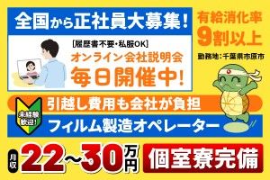 仕事内容 <仕事内容> AGC千葉工場にて3交代 フィルム製造オペレーター <具体的には> 3交代シフトでペレット状の原料を投入し、 押し出し機の運転、機器の整備を行います。 <職場環境について> ごみを嫌う製品なので、クリーン環境での 作業となります。 室内は空調が効いているので、快適に作業を 行えます。 <入社後について> 配属先の先輩が、仕事の基本からじっくり レクチャー。挨拶の仕方、1日の流れ、 部品の名前、機械の使い方、休憩所での 楽しい過ごし方など、あなたが安心して 馴染めるよう、丁寧にお教えしていきます。 <職場環境> 20代~30代のスタッフが中心となり、 活躍しています。 勤務は1ヶ月前にシフトで組まれて予定が わかります。 <未経験者も活躍中> 現在活躍中のメンバーもほとんどが 未経験スタート。 みんな丁寧なレクチャーを受けて成長 していきました。 あなたのこともマンツーマンで指導するので、 安心して下さいね。 <魅力ポイント> ・未経験から正社員スタート! ・月収28万円以上&安定収入 ・生活費を抑えられる食事付独身寮完備! ・資格取得支援制度あり ・入社お祝金10万円支給 WEB面接も対応可能ですので、 少しでもご興味をお持ちいただいた方は、 ぜひお気軽にご応募ください! ★事業拡大につき入社お祝金10万円を支給! 転職のため支度金として活用ください。 ※詳しくは入社時に説明します。 ================== ハローワークでお仕事をお探しの方、 製造や工業内作業・フォークリフト、 オペレーターを希望されている方、 ぜひご応募ください。 ================== [こんな人が活躍] \★異業種からの転職も応援★/ こんな思いの方はぜひご応募ください! ◎未経験から新しいことにチャレンジしたい ◎ものづくりに携わりたい ◎安定企業で腰を据えて働きたい ◎無理なく続けられる職場が良い などなど