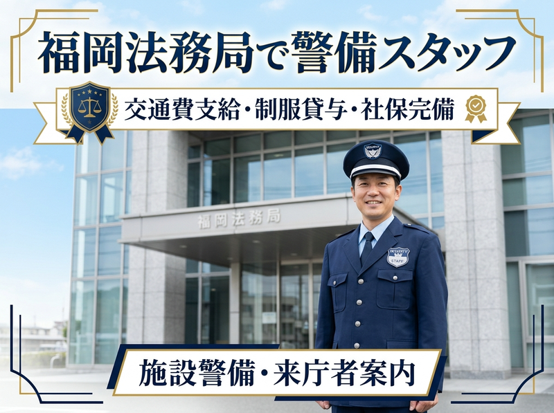 仕事内容 福岡法務局庁舎内における施設警備業務をお任せします。 官公庁施設での勤務のため、落ち着いた環境で働ける警備のお仕事です。 主な業務内容 ⏩庁舎内指定場所での警備・立哨 ⏩来庁者や車両の案内・誘導 ⏩庁舎内外の巡回警備 ⏩不審者・不審物の確認 ⏩施設内の安全確認 ⏩駐車場及び周辺道路の車両整理及び誘導 アピールポイント ⭐官公庁施設で安定勤務 ⭐未経験でも研修制度あり ⭐落ち着いた環境で長く働ける ⭐警備経験者は経験を活かせます