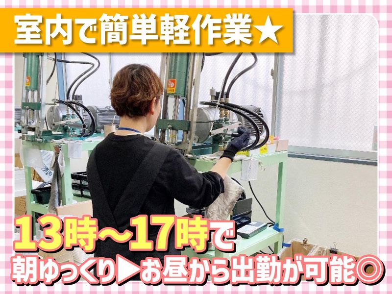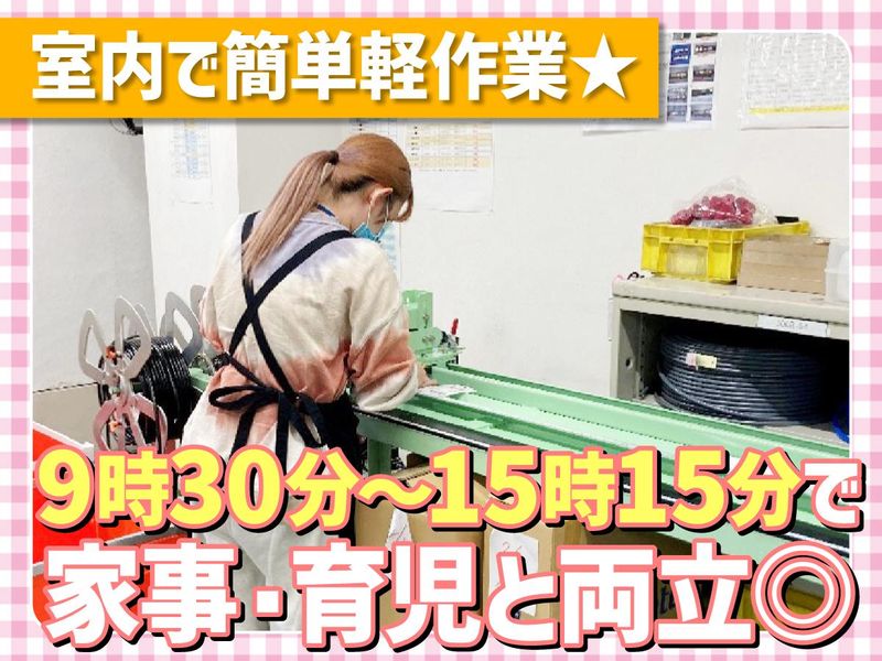 仕事内容 ✅未経験OK*簡単軽作業 └▶チームで作業もOK! ✅主婦(夫)活躍中✅30代・40代活躍中 ✅平日のみ ✅選べる勤務時間×残業ほぼナシ!(17時まで) *- お任せする作業はとっても簡単 軽作業♪ -* 具体的には… 「機械でのホース・金具止め作業」が中心! その他は… ・リスト通りにピッキング、仕分け ・検査道具を使ってサイズが合っているかなどのチェック・検品 ・簡単な部品のカット(台にセットして、上から押すだけOK!) ・袋詰め など \ 誰でも簡単にできる作業 /です◎ <扱う部品> 樹脂ホースや金具等。 ↑特別なものではなく、ホームセンターで見慣れたものです! \ 商品知識一切不問! / *- 未経験OK☆初めてお仕事もOKです! -* 今いるスタッフの9割が未経験スタート◎ 勤務時間内で簡単な座学と実演の講習があり、 安心して初めていただけます! 1つ1つコツコツ丁寧な作業できれば大丈夫です◎ *- アナタらしく◎働くスタイル選べます! -* 作業内容は… <チームでワイワイ協力>タイプ! ご希望はお気軽にご相談ください! 勤務時間は… <①9:30~15:15><②13:00~17:00> 上記から選択可能です! ※長時間勤務歓迎 「子供を送り出して一緒に出勤、16時から家事」 「朝はゆっくりしたいから、遅めのお昼から出勤」 など、アナタに合った働き方を選んでください◎