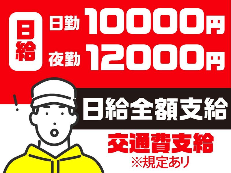日給10,000円以上 給与詳細 基本給:日給 1万円 〜 固定残業代:なし 【一律手当】 全員に一律で支払われる通勤・皆勤・家族手当金額:なし 全員に一律で支払われるその他手当金額:なし 【日勤】1万円~ 【夜勤】1万2000円~ ★早上がりでも全額日給保証!★ ★日払いOKで翌日収入GET!★ 【給与例】 給与例 ◆週5日/夜勤のみ ・日給1万2000円×22日 ⇒月収26万4000円 ◆週3日/日勤のみ ・日給1万円×12日 ⇒月収12万円 ◆週3日/日勤&夜勤 ・日給1万円×6日 + 日給1万2000円×6日 ⇒月収13万2000円 ※上記目安金額となります。