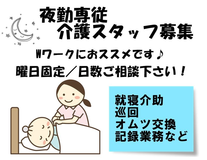 仕事の内容 社会福祉法人 慶生会での夜勤専従介護士(グループホームのヘルパー)になります。 なお本求人は職業紹介事業者である 株式会社生活支援センター・ひまわりによる紹介案件です。 ≪グループホーム≫で パート/夜勤専従介護スタッフさんの募集です!! 効率的にしっかり稼げるお仕事** スタッフみんなで意見を出し合い活気ある施設です◎ 無資格・未経験の方でもOK! 特別な経験や専門知識は必要ありません! 働きながらスキルを身に付けましょう♪ 【この求人のポイント!】 ・30代・40代・50代活躍中! ・2ユニット18人 ・週2日~OK! ・扶養内OK♪ ・曜日・日数などご相談ください♪ ・無資格未経験OK ・ブランクOK! ・ネイルOK・髪染めOK(いずれも基準あり) 【ひまわりのサポート体制】 ・お忙しい方やお電話が苦手な方はLINEでの相談OK ・多数案件あり/ご希望に合わせてご案内可能! ・専任のコーディネーターが、 お仕事探し~就業後のアフターフォローまで徹底サポート! ・面談・初日も同行するので安心◎ 【業務内容】 巡回、おむつ交換、食事介助、排泄介助、記録など