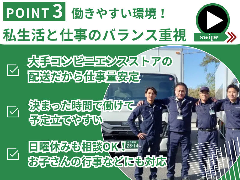 仕事内容 【おすすめポイント♪】 ◎未経験歓迎!普通免許があればOK! ◎決まったルートへ配送するルーティン業務! ◎いきなり月給33万円以上! ◎水曜、土曜定休で予定も立てやすい♪ \未経験歓迎!普通自動車免許があれば応募OK◎/ 必要な資格は入社後に資格取得支援制度を利用して取得可能! ※取得までの期間はワゴン車等を使用して配送研修を実施! ==お任せする仕事== アイスクリームや冷凍食品などを各店舗へ配送していただきます。 <具体的には…> 配送先:大手コンビニチェーン店 配達数:13店舗程度 保冷バックに入った商品を運びます 決められたルートでを走るため、覚えやすいのが特徴です◎ ※配送する商品は事前に仕分けスタッフが準備しているので、対応不要です! 平均年齢:53歳 幅広い年齢の方が活躍しています! ==仕事のPOINT== ★☆ドライバーデビューを応援します! 入社後は1〜2ヶ月以上かけて同乗研修を実施するため、 普通自動車免許さえあればすぐにスタートできます♪ 女性スタッフも活躍中です◎ ★☆キャリアアップも目指せます! 準中型・中型・大型免許が取得できる資格取得支援制度あり! 希望によりステップアップ・キャリアアップも目指せます◎ 【当社について】 茨城県に密着して着々と実績を積み重ねてきた当社。 これまで長年にわたり地域に貢献してきたことから、 他の地元企業や地域の方々より多くの信頼をいただいております◎ 1つの事業に固執せず、サービスを展開しています! こうした基盤があるため安心して長く働いていただくことが可能です♪