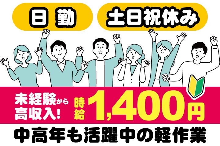 仕事内容 日勤・土日祝休みで基本残業なし! オン・オフのメリハリをつけてお仕事OK! カンタン軽作業からスタートなので安心!有給休憩1時間あり! 20代・30代・40代・50代など若手から中高年の男女スタッフ活躍中! 正社員登用実績あり!長期安定目指したい方にオススメ! ▼この募集のポイント 〇高時給1,400円 〇日勤・土日祝休み 〇基本残業無し 〇1時間の有給休憩あり 〇未経験者歓迎 〇中高年も活躍中 〇派遣社員にも業績賞与あり 〇正社員登用実績あり ▼カンタン軽作業からスタート 乾燥飼料の製造工場でカンタン作業をお任せします。 袋を機械にセット→中身が自動で入るので、空気を抜いて袋を縛るだけ! 和気あいあいの仲間たちと一緒に働きますが、皆さんお仕事はモクモクこなしてます。 オンオフのメリハリがしっかりしていて働きやすい雰囲気が自慢です! ▼未経験でも安心スタート 未経験の方もゆっくり慣れていけば大丈夫なので安心してくださいね。 フォークリフト資格者はさらに高時給1,600円! 入社後にフォークリフト免許を取得したら給与アップがあります。 資格取得サポートの制度もあり! ▼人気の日勤・土日祝休み 勤務は日勤専属で残業ほぼ無し!無理なく安定収入を目指せます。 土日祝休みだから、オンオフのメリハリをつけてリフレッシュできます。 長期休暇の取得も相談OK! すぐ働きたい方も歓迎!即日勤務スタートOKです。 正社員登用の実績があるので、長期安定を目指すあなたにもオススメ! 他にも、あなたにピッタリなお仕事がきっと見つかる! まずはお気軽に採用担当へご相談ください。
