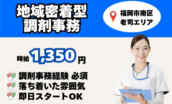 交通アクセス 最寄駅:西鉄大橋駅 バス20分分 老司小学校前 徒歩1分 調剤事務経験必須/長期/高時給1300円