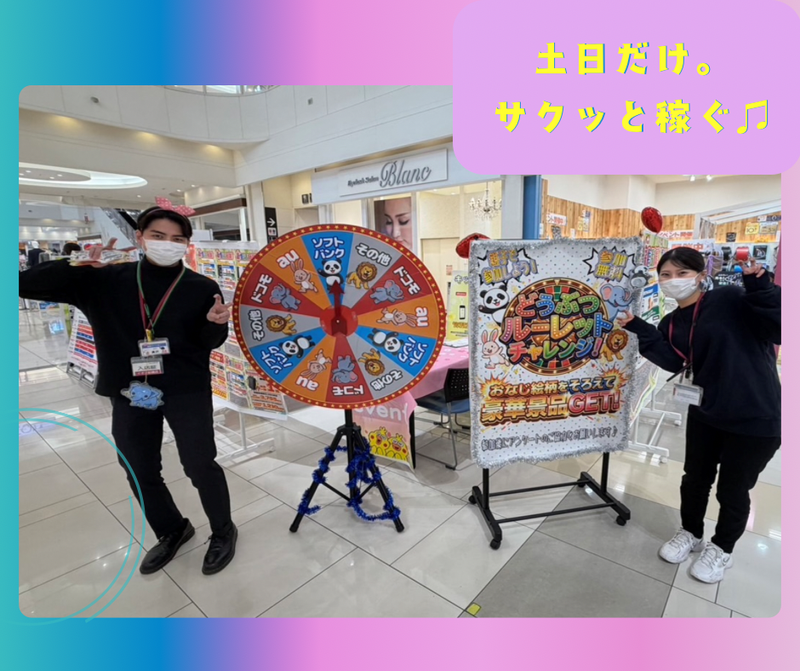 仕事内容 <このバイトのおすすめポイント!> ・空いてる日だけでOK! 効率よくサクッと稼げる♪ ・イベント会場で楽しくお仕事! にぎやかな雰囲気◎ ・週末のみ勤務!副業・Wワークも歓迎! ・接客やコミュ力が自然と身につく! 携帯キャリアのキャンペーンイベントを サポートしていただくお仕事です。 柏駅周辺のショッピングモールや 家電量販店の特設会場で、 ゲームや抽選会を盛り上げたり、 来場者に声かけをする楽しいバイトです! <お仕事内容> ・イベント会場の準備(POPや風船などの飾りつけ) ・オープニング後、お客さんへの声かけ、 ゲームや抽選会の案内 ・お子さん向けのゲーム進行や景品渡し ・備品の準備・補充 ・イベント終了後の片付けや在庫チェック ・簡単なアンケートの回収 <希望があればこんなお仕事も!> ・興味を持ってくれたお客さんに キャンペーンや携帯プランのご案内 ・契約手続きのサポート ※対応できる方は【時給アップ】のチャンスあり! <シフトについて> 「まずは話だけ聞いてみたい!」 「もう少し詳しく知りたい!」 「シフトの相談をしたい!」など、 選考に進むか決めてなくてもOK! 気軽にお問い合わせください♪