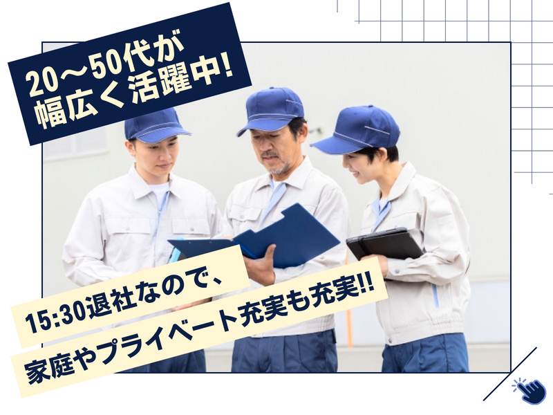 職場環境 少人数で全員の距離感が近い職場。 入社後は先輩が隣で業務を教えます。 作業エリアは整理整頓が 行き届いています。 喫煙所:喫煙所あり(屋外)
