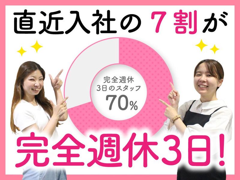 休日休暇 <完全週休3日制> 水・日・土 <完全週休2日制> 水・日 【その他の休日】 *GW休暇 *夏季休暇 *年末年始休暇 *慶弔休暇 *産前・産後休暇 *介護休暇 *育児休暇 *有給休暇 ★休日も“選べる”★ 実際に活躍している社員の 7割は<完全週休3日制>を 選択しています♪ 「趣味に時間を使いたい」 「家族との時間を大切にしたい」 「週4日出勤のほうが集中できる」 というスタッフも多数!