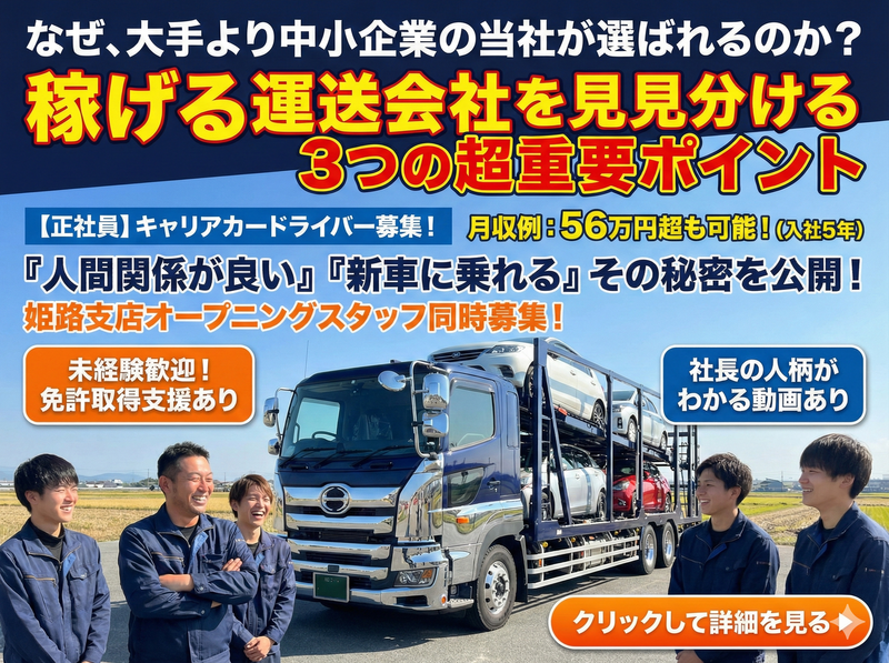 仕事内容 失敗しない会社選び。 なぜ、大手運送会社より当社が 就職先に選ばれるのか? 会社って大手の方が 信用できますよね? でも、実際は中小である当社 で快適に働く人が増え続けて いるんです。 実際の声を掲載しますので その秘密をまず確かめてみてください。 あなたは今、こんな状況では ありませんか? ・オープニングスタッフとして 自由にノビノビと働きたい ・周りのスタッフよりも業務量を こなしているのに給料が上がらない ・乗ってる車がボロボロで事故を 起こしそうで怖い ・荷上げ荷下ろしの際に駐車する場所に 困って仕事がしにくい ・業界未経験で入社してほったらかしに されないか不安 ・社長が会社を私物化してやりたい放題 もし、このような状況でで 仕事探しをしているのであれば、 当社の環境はあなたにピッタリです。 運送業界は「キツイ!」と 言われているのに なぜ株式会社モリシタが 働きやすいのか? 株式会社モリシタが 働きやすい6つの理由 理由1. 代表の森下が、スタッフ 一人一人と人として 向き合うから まずは下記にある 社長のYouTube動画を ご覧になってみてください。 その人柄が伝わると思います。 自分の考えを押し付けるのではなく 相手の話を聞く姿勢を持っている 社長の人柄がまずは当社の 何よりの魅力の一つです。 理由2. スタッフ同士が助け合う環境だから 運送業界は個人主義の会社が 多いですが、株式会社モリシタは チームワークを重視しています。 一人だけが負担が重くならないように ケアしながら情報共有もマメに 行っています。 理由3. 他社と協力してがんばろうと いう考えだから 他社を出し抜いて自社だけ 良い思いをしようという、 考えは古いというのが会社の 考えです。協力し合える部分は 協力し合い、健全な競争を心がける。 相手の利益と自社の利益の両方を 考え実行する。その方が気持ち良い 仕事ができるし、いかなる苦境も 乗り越えられるというのが 当社の考えです。 理由4. 基本は決まったルートの配送だから 近畿圏のオークション会場から 港の配送が主で、1日の走行も 平均で200km程度です。 車の荷上げ荷下ろしも一般道ではなく 港や会場で行うので、作業もしやすい。 比較的働きやすい現場です。 理由5. 新車に乗れるから キャリアカーを新しく購入しました ので、新車に乗ることができます。 理由6. 姫路支店のオープニングスタッフとして 自由にノビノビと働けるから 株式会社モリシタは本社が 大阪府高石市です。 今回、姫路に初進出となります。 先輩がいないという環境で 自由に働けます。 それだけ責任も求められますが 自由に働きたい人には ピッタリの環境だと思います。 1日の仕事の流れ オークション会場で車両引取 8:00 ↓ お客様ヤードへ搬入 13:00 ↓ オークション会場で車両引取 ↓ お客様ヤードへ搬入 ↓ 帰社 17:00 もういちど引取があれば 19時帰社ぐらいになります。 車形状 キャリアカー 輸送品目 車両 ・未経験者が仕事を覚えるまでの流れ 入社後まず先輩の横乗りからスタートします。 1ヶ月〜2ヶ月 1.最初は先輩がやってる作業を 見て覚えてください。 2.今度は先輩の指示通りに作業を 手伝ってください。 3.次は自分で作業をやってみてください。 先輩がその作業をチェックします。 1〜3を作業毎に反復します。 じっくり時間をかけて覚えてください。 株式会社モリシタ姫路支店がある 兵庫県姫路市夢前町について 兵庫県姫路市夢前町は、 自然と温泉と歴史豊かなまちです。 雪彦峰山県立自然公園、塩田温泉、 夢前川の清流など 自然いっぱいの美しいまちです。 ・会社概要 社名 株式会社 モリシタ 代表取締役 森下 孝司 住所 〒595-0081 大阪府高石市南高砂2 助松8号付属事務所1F 姫路支店 兵庫県姫路市夢前町菅生澗2-3 事業目的 ◇一般貨物自動車運送業 ◇貨物運送取扱業 ◇倉庫業 ◇車両回送業 ◇自動車販売業 ◇前各号に付帯関連する一切の事業 資本金 1,200万円 設立年月日 平成18年9月14日 従業員 25人 車両台数 16台 主要取引先 イースタンカーライナー 株式会社 株式会社 KLC 東西海運 株式会社 日本海港運 株式会社 株式会社 日新 藤原運輸 株式会社 辻本運輸 株式会社 有限会社 西川運輸 有限会社 ファイン 株式会社 レトリバー 和田貿易運送 株式会社 ホームページ http://morishita-rikusou.co.jp/ ・募集要項 雇用形態 正社員 仕事内容 キャリアカードライバー募集中! オークション会場・貿易会社ヤード ・車屋さんへお届けする車を キャリアカーに積んで 運んでいただきます。 さまざまな場所から車両を 引取お客様ヤードへ搬入する トラックの運転手です。 新車が空いてます! 業界未経験者でもしっかり支援します!! 免許取得制度でステップアップできます♪ 車好きにはとても楽しい仕事ですよ! 活気のある当社で一緒に働きませんか! 当社は従業員の平均年齢が若く、 とても活気の溢れる会社です! 社員仲の良い、和気あいあいと した雰囲気が自慢です♪ トラックに自動車を 積み込み輸送するお仕事です。 今