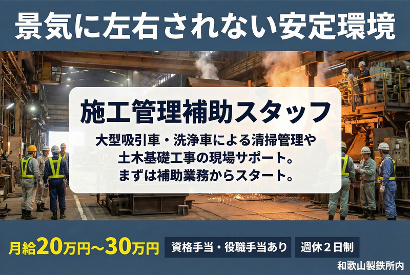 アピールポイント: 【この求人のポイント】 ✅ 日本最大手製鉄所内の安定環境で働ける ✅ 未経験OK!資格取得支援で手に職がつく ✅ 日勤のみ&残業ほぼなしでプライベート充実 ✅百年企業表彰企業!安定企業で安心して働けます♪ 【弊社について】 当社は、日本最大手鉄鋼メーカー「日本製鉄」の和歌山製鉄所内にて、設備清掃や土木工事の施工管理を担っています。 安定した需要と確かな技術力により、景気に左右されにくい事業基盤を築いています。 【弊社の強み】 ・大手製鉄所内での安定した仕事量 ・ISO9001認証取得の安心・安全な環境 ・未経験から国家資格取得まで支援 【募集背景】 業績好調に伴い、次世代の育成を目的とした増員募集です。 未経験から長く活躍できる人材を育てていきます。