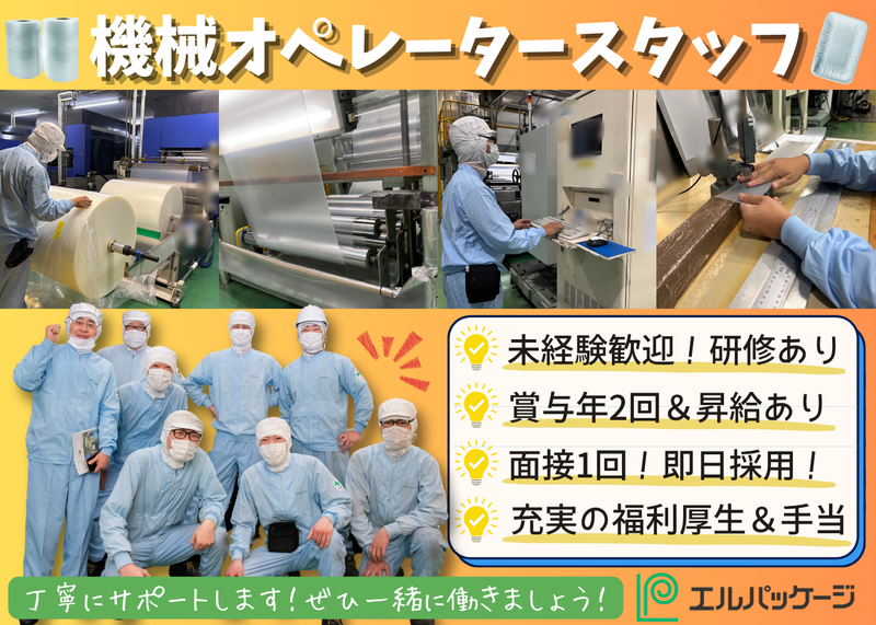 仕事内容 \モノづくりに興味があればOK!✨/ ボタン操作で食品トレーを作るシンプルワーク! \手に職つけて、安心スタート!✨/ あの冷凍餃子のトレー、作ってるのは自分かも!? ✅面接は1回だけ!むずかしい書類やテストもありません♪ ✅高校卒業したばかりの方・はじめての仕事でも大歓迎! ✅ボーナスは年に2回!手当もあって、がんばりがしっかり反映されます✨ ✅社員どうし仲がよく、明るく話しやすい職場です! ✅週2日はしっかりお休み♪長い休みもあって、プライベートも楽しめます! ✅有休を使って旅行に行く人もたくさんいます◎ ✅夏は飲み物の支給あり!ごはんはお弁当を注文できます(お茶・みそ汁付き!※時期による) ⏰エルパッケージってどんな会社?  ̄ ̄ ̄ ̄ ̄ ̄ ̄ ̄ ̄ ̄ ̄ ̄ ̄ ̄ ̄ ̄ ̄ エルパッケージは、 “地球にも人にもやさしい包装(ほうそう)”をめざしている会社です! スーパーやコンビニ、病院などで使われるプラスチック容器を作っています。 冷凍食品のトレーやおかずのパックなど、みなさんがよく見るあの商品も…実はウチで作ってるかも!? ◎ シートを作るところから、容器になるまで一貫して生産! ◎ 工場の中でもリサイクルを進めています! ◎ 環境にやさしい素材(ポリプロピレン)を使った製品づくり! ムダを出さず、これからの時代に合った「サステナブル(=持続可能)」なものづくりを大切にしている会社です! ⏰仕事内容  ̄ ̄ ̄ ̄ ̄ ̄ コンビニやスーパー、病院などで使われるプラスチックの容器を作るお仕事です! たとえば、冷凍シュウマイや餃子の“あのトレー”や、コンビニのパスタ容器など、 身近な商品に使われている容器を、私たちが製造しています! 【お任せしたいのはこんなお仕事】 ■機械のボタンを押して、プラスチックのシートをつくる ■機械がきちんと動いているかチェック ■出来上がったシートがきれいかどうかを確認 ≪作業の流れ(かんたんに言うと…)≫ 例えば・・ ① 「シート」をつくる機械に材料を入れて、ボタンでスタート! ② 温度やスピードを画面で見ながら、調整していきます ③ 出てきたシートをチェックして、次の工程にまわします 今回のお仕事は、この「シートをつくるところ」を担当してもらいます! 自分の操作で仕上がりが変わるので、慣れてくると「自分で作った感」があって面白いですよ! ≪入社後のサポート体制≫ まずはカンタンな作業からスタートするので安心です! 操作マニュアルもあり、OJT(=先輩がつきそって教えてくれる研修)も用意しています。 班長や先輩スタッフがマンツーマンでしっかりサポートするので、未経験の方でも大丈夫◎ わからないことは何でも聞きやすく、困ったときにはすぐ相談できる職場です! 工場でのお仕事ではありますが、社員やパートさんとも気さくに話せる雰囲気で、 新人さんもなじみやすい環境が整っています♪ ⏰社員インタビュー  ̄ ̄ ̄ ̄ ̄ ̄ ̄ ̄ ̄ ̄ 【▼入社1年目・10代(高卒入社)】 ⏬エルパッケージに興味を持ったきっかけは? もともと機械を触るのが好きで、手に職をつけたいと思っていました。 高校の先生から「機械操作の仕事がある」と紹介され、面白そうだと思って応募しました。 未経験だったので不安もありましたが、操作はマニュアルがあるし、先輩がマンツーマンで教えてくれるので安心してスタートできました! ⏬嬉しいとき、やりがいを感じるときはありますか? 自分が操作した機械から、製品がきれいに出てくる瞬間がすごく気持ちいいです。 押出成形って見ているだけでも楽しくて、調整した温度やスピードで仕上がりが変わるのが面白いです。 最近は少しずつ、自分で点検や微調整も任せてもらえるようになって、成長を実感できています! ⏬社内の雰囲気はどうですか? 質問しやすい雰囲気があって、先輩たちも優しいです! 操作ミスをしても怒られることはなく、「次はこうしてみよう」とアドバイスしてくれるので安心です。 休憩中は冗談を言い合ったりして、職場も明るいですよ! 【▼入社5年目・20代】 ⏬入社のきっかけは? もともと機械いじりが好きで、「自分の手でモノを作る仕事がしたい」と思っていたところ、学校の先生にエルパッケージを紹介されました。 実際に工場見学に行ってみたら、オートメーションの設備や成形の工程がすごく興味深くて、ここで働きたい!と思いました。 ⏬嬉しいとき、やりがいを感じるときはありますか? 機械の温度やスピードを自分で調整して、理想通りの製品ができたときが一番嬉しいです! 「この条件でうまくいった!」と記録して、次につなげていくのも面白さのひとつ。 少しの調整で品質が変わるので、経験を積むごとに仕事の奥深さを感じます。 ⏬逆にきついときはありますか? 最初は専門用語や機械の名称が多くて戸惑いましたが、繰り返し教えてもらえるので自然と覚えられました。 ⏬社内の雰囲気はどうですか? 休憩時間には、機械の話から趣味の話まで、和気あいあいと雑談しています。 仕事中は