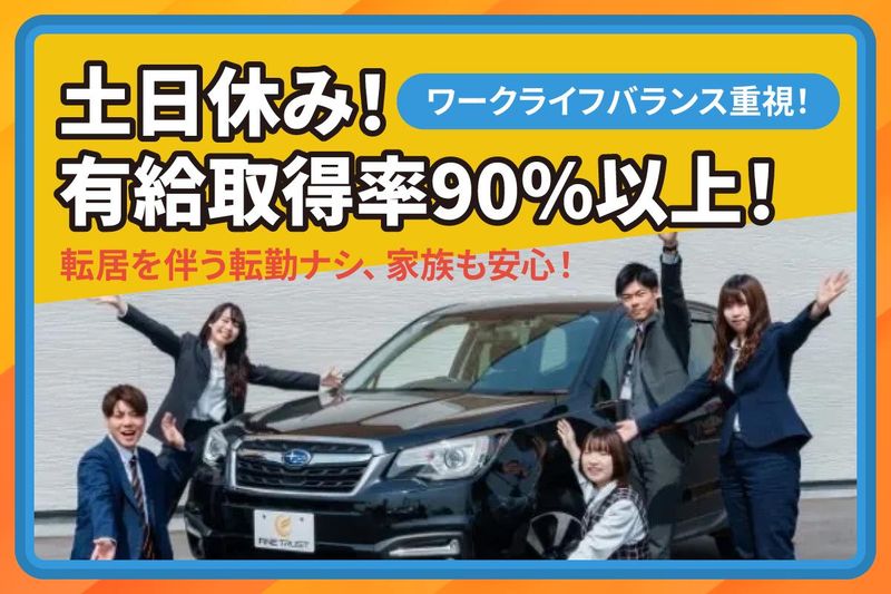 仕事内容 ━━━━━━━━━━━━━━━━━━━ ⭐未経験でも【月給30万円】スタート ⭐インセン:粗利に対して最大10%! ⭐20〜30代が中心に活躍中! ━━━━━━━━━━━━━━━━━━━ 14年連続で売上UP!25年9月には 【売上152億円】突破の成長企業。 安定×高収入×働きやすさを実現した 環境で新しいキャリアを築けます。 ━━━━━━━━━━━━━━━━━━━ お任せするお仕事 ━━━━━━━━━━━━━━━━━━━ ⭐完全反響営業で未経験も安心 ⭐飛び込み・新規開拓・ノルマなし *来店されたお客様の査定対応 *予約済みのお客様宅で出張査定 *車情報をアプリ入力→金額自動算出 *上司と相談しながら金額提示→契約 専門知識ゼロでも始められる環境です! ━━━━━━━━━━━━━━━━━━━ 未経験でもしっかり稼げる ━━━━━━━━━━━━━━━━━━━ ⭐月給30万円以上+インセンあり ⭐インセン:粗利に対して最大10%支給! 完全反響だから成果が出しやすく、 収入アップを狙いやすいのが魅力! ━━━━━━━━━━━━━━━━━━━ キャリアアップもスピーディ ━━━━━━━━━━━━━━━━━━━ ⭐管理職平均年齢32歳 ⭐入社1年で店長抜擢の実績あり 年齢・社歴ではなく実力を正当に評価。 20〜30代が中心の若手組織で、 早期昇進のチャンスも豊富です! ━━━━━━━━━━━━━━━━━━━ 働きやすさも業界トップ級 ━━━━━━━━━━━━━━━━━━━ ⭐年間休日130日 ⭐月8日以上休み ⭐毎週3日は残業ゼロ ⭐土日休み相談OK ⭐夏季・年末年始の長期休暇あり ⭐有給取得率90%以上 ⭐誕生日休暇や産育休も充実 仕事もプライベートも大切にできる 長く働ける環境が整っています。 ━━━━━━━━━━━━━━━━━━━ 職場の雰囲気はSNSでも発信中 ━━━━━━━━━━━━━━━━━━━ ⭐Instagram https://www.instagram.com/finetrust_recruit/reels/ ⭐YouTube https://www.youtube.com/@FINETRUST https://www.youtube.com/@FINE_TRUST