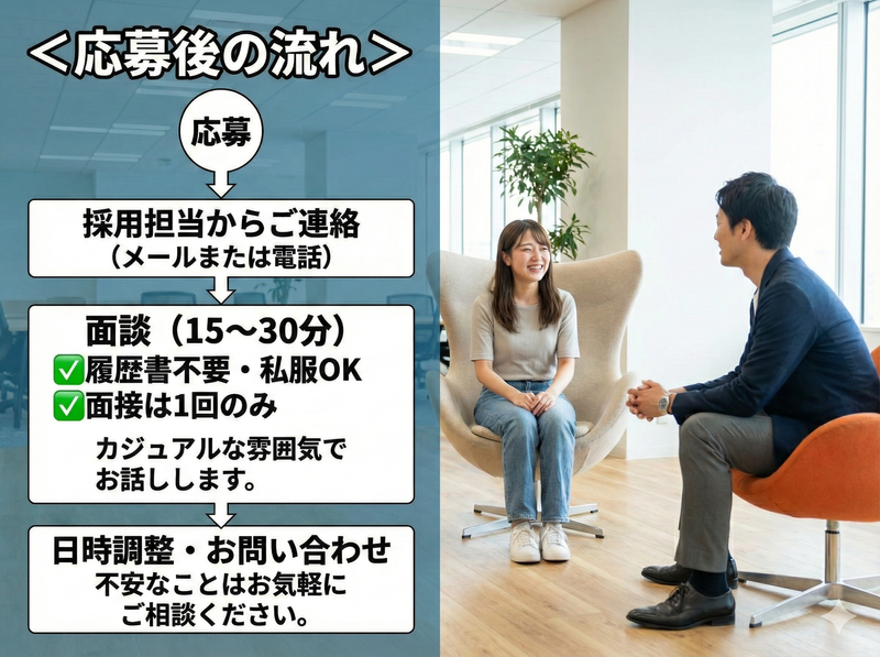 選考プロセス 【応募後の流れ】 応募 ↓ 採用担当からメール、 または電話にてご連絡します。 ご連絡の際に面接の日時を調整します。 【採用までの流れ】 ✅入社まで内定から最短1週間 ✅面接は1回(面談のような感じです) ✅面接時履歴書不要 不安に感じていることは 些細なことでも結構ですので、 お気軽にご相談ください。 「気になるな、話を聞いてみたい」 などの応募でもOK! 気軽にご応募ください♪ <問い合わせ先> アップセルテクノロジィーズ株式会社 高松支店 TEL:087-812-0170 採用担当まで!