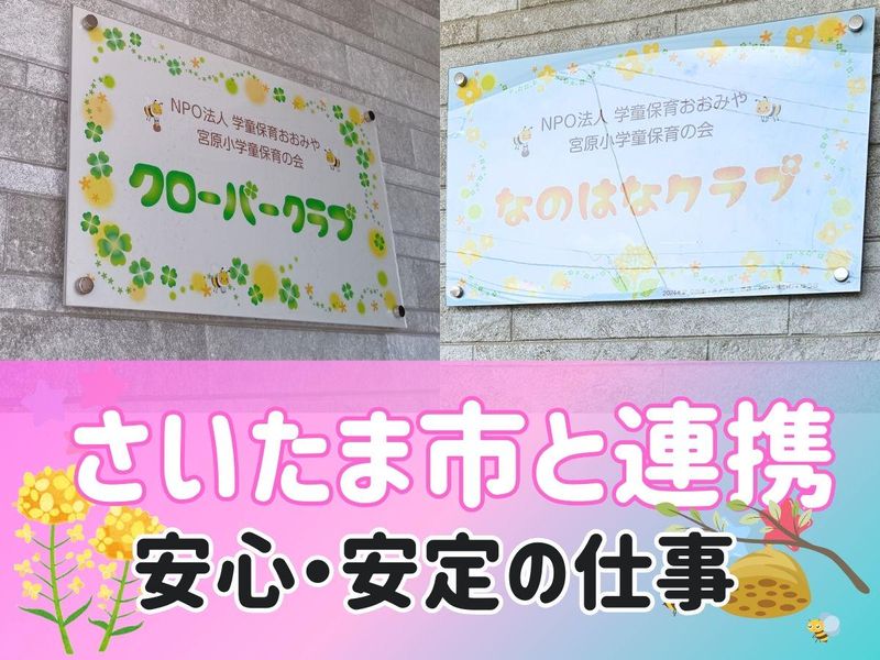 仕事内容 ✼••┈┈┈┈••✼••┈┈┈┈••✼ サポートスタッフ募集 ✼••┈┈┈┈••✼••┈┈┈┈••✼ 放課後児童支援員のお仕事をお任せします! 勤務地は・・・ ✅宮原町にある「クローバークラブ」 (クローバークラブの2階がなのはなクラブ) ✅吉野町にある「はちのすクラブ」 の2施設のうち、希望の施設を選べます。 主な業務内容は・・・ ✨放課後児童の見守り ✨宿題のサポート ✨一緒に遊んで笑顔をつくる ✨おやつの準備(買い出しや簡単な調理) ✨正規支援員のサポート など 施設の特徴は・・・ ✅スタッフ同士の連携が抜群! ✅何でも気軽に聞ける環境☆ ✅経験も資格も不要です♪ ✅子どもとスタッフの関係も◎ ✅父母会との関係も良好! 地域で子育てをしています✨ 子どもたちの笑顔を守り、成長を育むため 一緒にお仕事に挑戦してみませんか? ⏰1日の流れ⏰ ✅14:00頃出勤 スタッフ同士のミーティング おやつの準備、室内の整理 など ✅14:50頃~ 子どもたちが学校から帰宅 敷地内で子どもたちと一緒に遊びます! 公園や校庭にお出かけすることも♪ ✅16:30頃~ おやつタイム&自由時間 遊ぶ子や宿題をする子など様々。 子ども達の気持ちを尊重します。 お迎えに来た保護者様に 子どもたちの様子をお伝えします。 ※出勤時間は長期休みや行事等で変更もあります 【勤務地について】 ⭐クローバークラブ 北区宮原町4-137-8 1F (最寄り)東武バス「奈良中央」or「宮原4丁目」 ⭐はちのすクラブ 北区吉野町1-395-1 (最寄駅)ニューシャトル今羽駅・JR宮原駅 ~* わたしたちについて *~ <宮原小学童保育の会ってどんな施設?> さいたま市より委託を受けて学童保育を利用している保護者の会が運営をしています。 吉野町のはちのすクラブ、宮原町のクローバークラブという2つのクラブでそれぞれ45名ほどの児童をお預かりしており それぞれ4~5名の正規・パート支援員で保育を行っております。 学童保育は放課後のおうちのような存在になれたらと考えています。 生活の中での様々な思いに寄り添いながら、子どもを中心に、保護者の皆さんと支援員が一緒に子育てをしていきます。 見学も可能なのでお気軽にお問い合わせください♪ <NPO法人学童保育おおみやについて> 特定非営利活動(NPO)法人学童保育おおみやは、さいたま市内9学校区に26の学童保育所が集まって、一つの法人となっています。 様々な運営形態の学童クラブがありますが、弊社の学童クラブは父母会と協力をして、より良い学童クラブ創りを目指しています。 支えてくださる保護者の方々にも恵まれ、児童・保護者・支援員それぞれに寄り添った環境作りを目指しており、安定した雇用の中で責任をもって保育をしてもらうことを大事にしています。 <学童保育の仕事内容は?> 留守家庭児童の放課後の生活や長期休業に合わせ育成支援を行っており、支援員は子どもたちの”安心と安全”を第一に考えています