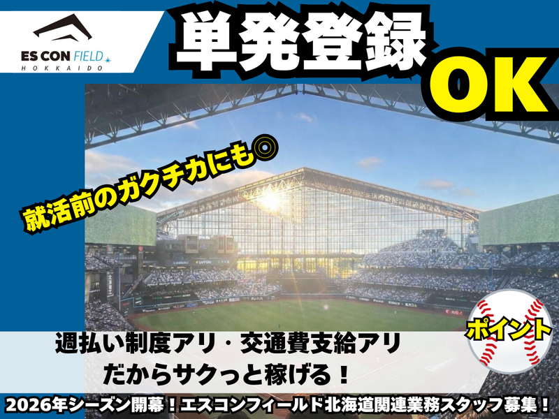 仕事内容 開業から弊社が担当し、 4年目の実績のあるお仕事です♪ いまだ注目度の高い『エスコンフィールド北海道』のお仕事を通じて 私たちと一緒に今シーズンを盛り上げそして駆け抜ける 新たな仲間たちを募集します! ⚾⚾⚾⚾⚾⚾⚾⚾⚾⚾⚾⚾⚾⚾⚾⚾⚾⚾⚾⚾ ◆2023年3月に開業した新球場◆ ✨エスコンフィールド北海道✨ 今や北海道を代表する複合型テーマパークのような ランドマークへ成長した エスコンフィールドでのお仕事も 4年目シーズン開幕に向け、 『駐車場案内スタッフ』大募集! (※勤務日は主に試合がある日です) ⚾⚾⚾⚾⚾⚾⚾⚾⚾⚾⚾⚾⚾⚾⚾⚾⚾⚾⚾⚾ 【仕事内容】 ・車で来場されたお客様への駐車場案内 ・ご予約がないお客様への電子決済対応 ・シャトルバス/観光バスの停車位置案内 ・タクシー乗り場でのお客様対応 ・その他お問い合わせ対応 など 難しい作業はありません! お客様から「ありがとう」と言っていただける場面が多いお仕事です! 初めて勤務される方でも流れを見ながら徐々に慣れていける現場です! またすでに勤務しているベテランスタッフも多く存在しますので もし難しいな・・・困ったな・・・と思っても すぐにフォローできるので安心してお仕事していただけます! ≪試合がない日もお仕事できます!≫ エスコンのお仕事がない日でも 弊社が担当するイベントのお仕事にご応募いただけます! 例) ・音楽野外フェスでのフードブース運営 ・官公庁主催の子供向けイベントブース運営 ・各ランドマークでのサンプリングや各種プロモーションイベント…など *登録制のため、希望に応じて参加可能 ✨✨✨✨✨✨✨✨✨✨✨✨✨ 2023年3月にスタートした 北海道日本ハムファイターズの本拠地、 エスコンフィールドHOKKAIDO/ ボールパークFビレッジ。 北海道を代表するランドマークに成長した エスコンフィールドでのお仕事に携われる チャンスです! 未経験からでも安心してスタートできる お仕事です! ✨✨✨✨✨✨✨✨✨✨✨✨✨ 【お仕事のポイント】 ◆未経験者大歓迎! ◆週0日も可能!シフト融通◎ ◆年齢不問、性別不問で学生から50代まで活躍中! ◆平日のみ、土日祝のみOK