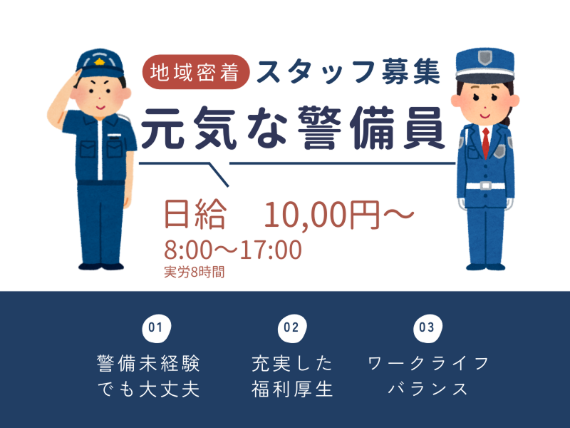 求める人材: ✅未経験スタート歓迎 ✅警備に興味のある方 ✅安定して長く働きたい方 ✅成長意欲のある方 年齢の条件と理由:あり(例外事由2号・18歳以上 (警備業法により)) 皆様のご応募お待ちしています! 未経験者歓迎/経験者優遇/フリーター歓迎/学歴不問