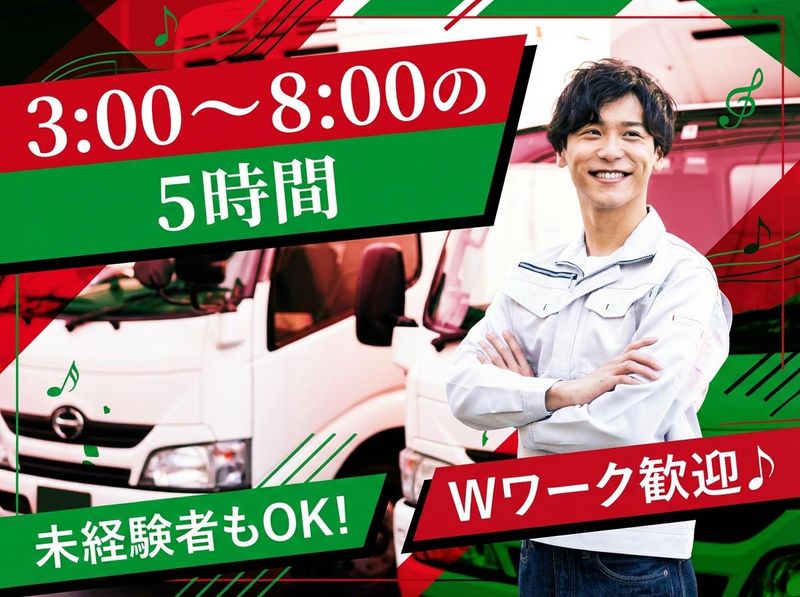 勤務時間詳細 実働時間:1日あたり5時間 平均勤務日数:1ヶ月あたり12日 〜 15日 3:00~8:00 勤務時間帯の関係上、 渋滞が発生しにくく、 時間をオーバーすることは 基本的にありません! ※3:00~5:00の勤務は18歳以上(例外事由2号:労働基準法)」