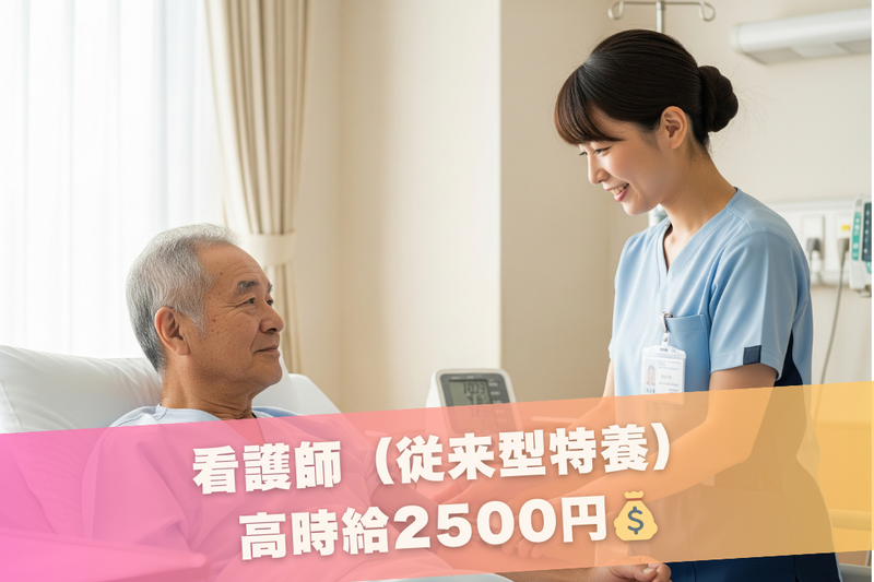 仕事の内容 \高時給2500円!日勤のみ&週4日~OK/船橋市エリアの特別養護老人ホーム(従来型)で、地域に貢献する看護のお仕事。 落ち着いた雰囲気の職場で、利用者様の健康をサポートします。 【お仕事内容】 特別養護老人ホーム(従来型)にて看護業務全般を担当していただきます。 ・バイタルチェック、健康管理 ・服薬管理、必要に応じた医療処置 ・医師との連携、緊急時の対応 ・介護スタッフとの情報共有、サポート ・看護記録の作成 ※日勤のみのお仕事です。 ※OJTで丁寧に指導いたします。 【こんな方におすすめです!】 ✅ 看護師・准看護師の資格を活かして、高時給で働きたい方。 ✅ 日勤のみで、家庭との両立を重視したい方。 ✅ 週4日以上、安定して働きたい方。 ✅ シフトの融通が利き、プライベートも大切にできる職場をお探しの方。 ✅ 車・バイク通勤を希望する方(駐車場無料)。