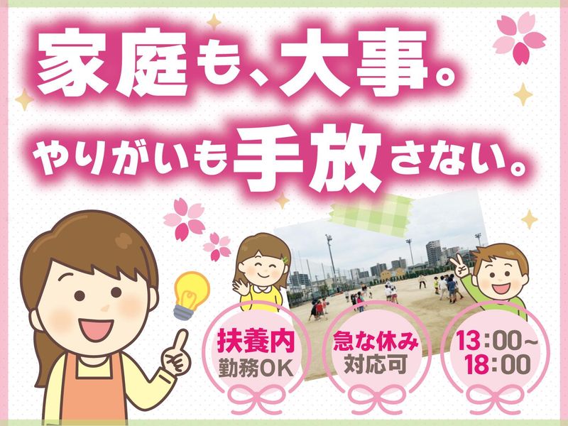 仕事内容 「子どもと関わる仕事がしたい」 「家庭と両立しながら働きたい」 そんな方にピッタリのお仕事です! 小学1年生~6年生の児童と 一緒に遊んだり、見守りをしながら 日々の生活をサポートいただきます。 \基本は午後からの勤務♪/ 午前中は家事や用事を 済ませてから働けるので、 ご家庭との両立もしやすい環境です◎ ―――――――――――――――――――― 全4クラスがあり、 各クラス30名~45名の児童を 3人ほどの先生で担当します! ひとりに負担が偏らないよう、 スタッフ同士で協力しながら 子どもたちを見守る体制です◎ ―――――――――――――――――――― ■ 具体的なお仕事内容 ・13:00~ ミーティングや掃除を行い 昨日あったことや今日必要なことなど 伝達事項を行います! (この時間に出勤している人で) ・14:30~ 子どもたちが来所するので、 手洗い・うがいの声かけや 宿題のサポートを行います。 基本的に子どもたちは 自主的に動ける環境のため、 付きっきりで対応する場面は少なめです◎ その後は、室内遊びや外遊びを 一緒に楽しみながら見守ります。 ―――――――――――――――――――― ■ 子どもたちを見守る大切なお仕事 児童が安心・安全に過ごせるよう、 環境を整えることも大切なお仕事です。 教室内の清掃や整理整頓、 衛生管理はもちろん、 子どもたちの様子に目を配り、 ケガや体調不良の早期発見、 トラブルの防止なども行います。 子どもたちの命と安全を守る、 責任ある役割ですが、 その分、日々の成長を間近で感じられる やりがいの大きなお仕事です! スタッフ同士でしっかり連携しながら 一人ひとりを見守る体制を整えているので、 未経験の方でも安心してスタートできます◎ ―――――――――――――――――――― ■ おおもとクラブの特徴 “けん玉”に力を入れている学童で、 子どもたちも楽しみながら取り組んでいます。 中には全国大会に出場したり、 1年生でもけん玉の資格を 取ったりするほどスゴイんです♪ 「けん玉はやったことがない…」 という方もご安心ください◎ 先生も最初は未経験からスタートしています! 一緒にやっていくうちに自然と慣れて、 気づけば子どもたちと 一緒に楽しめるようになりますよ♪ 大切なのは、上手さではなく 「一緒に楽しもうとする気持ち」です✨
